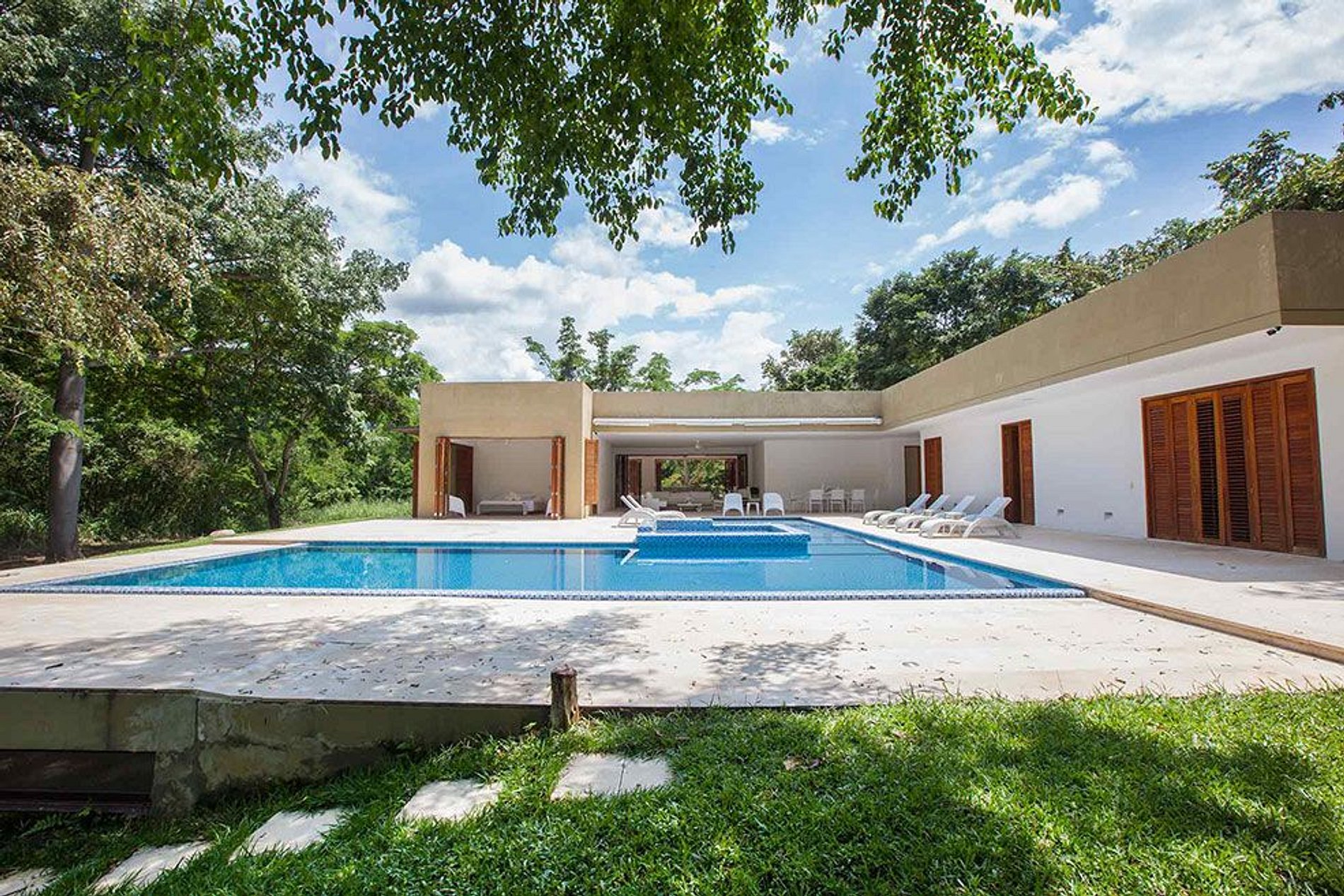 Cuenta con sala comedor amplios, cocina equipada, cuarto y baño del servicio, baño social, 5 habitaciones con capacidad para alojar hasta 16 huéspedes (cada habitación con baño privado) y piscina privada amplia. Como atención los anfitriones ofrecen café Colombiano a sus huéspedes... ademas, si los huéspedes son adultos pueden disfrutar de dos carros de golf.