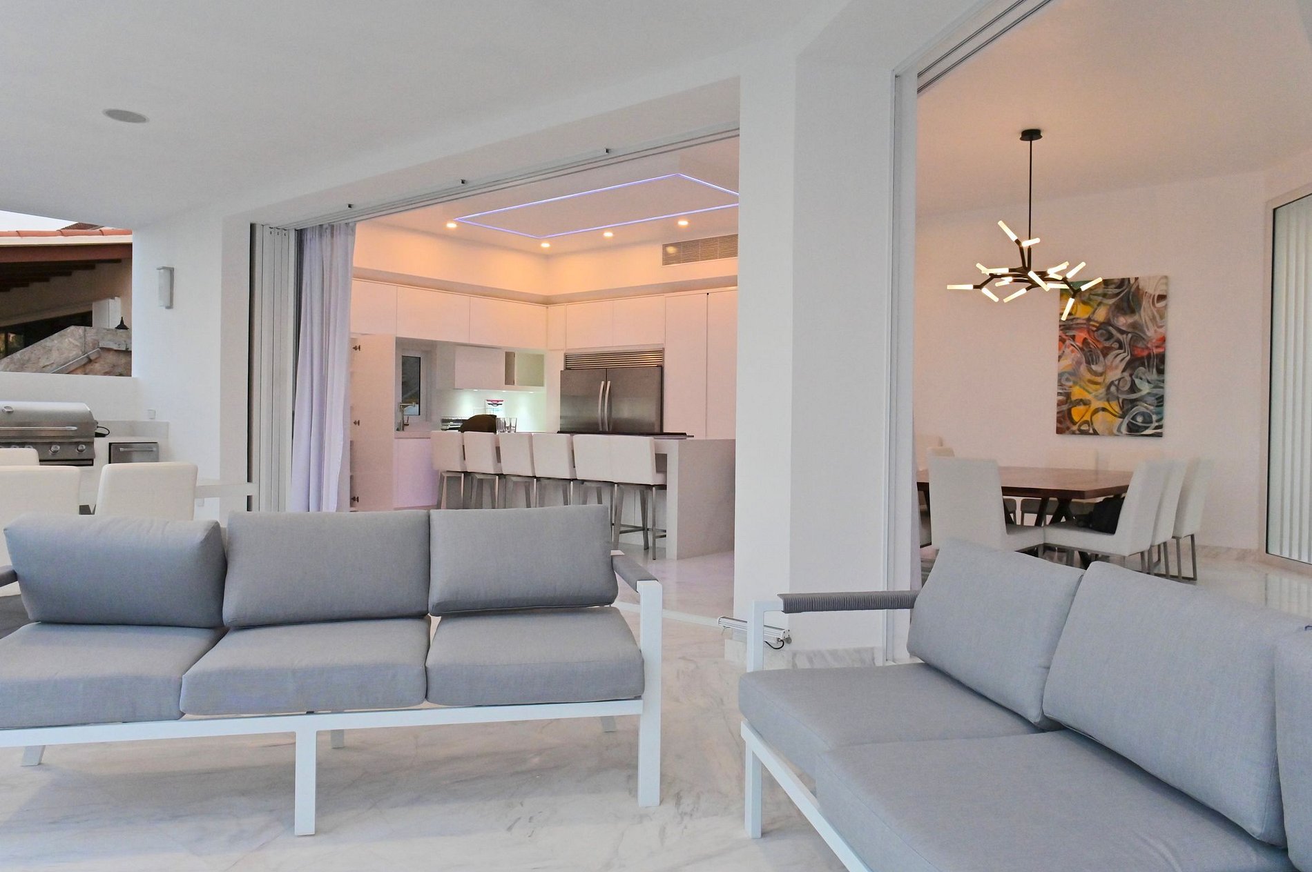 Su sala de televisión está cerca de la zona exterior y cuenta con un sofá en forma de U para disfrutar de agradables noches de televisión después de un día al sol. Su comedor, ubicado entre la sala de televisión y la cocina, cuenta con una mesa de comedor con capacidad para 10 personas cómodamente. La cocina está totalmente equipada con electrodomésticos modernos y un mostrador con una estufa, perfecta para que un chef privado cocine deliciosas comidas.