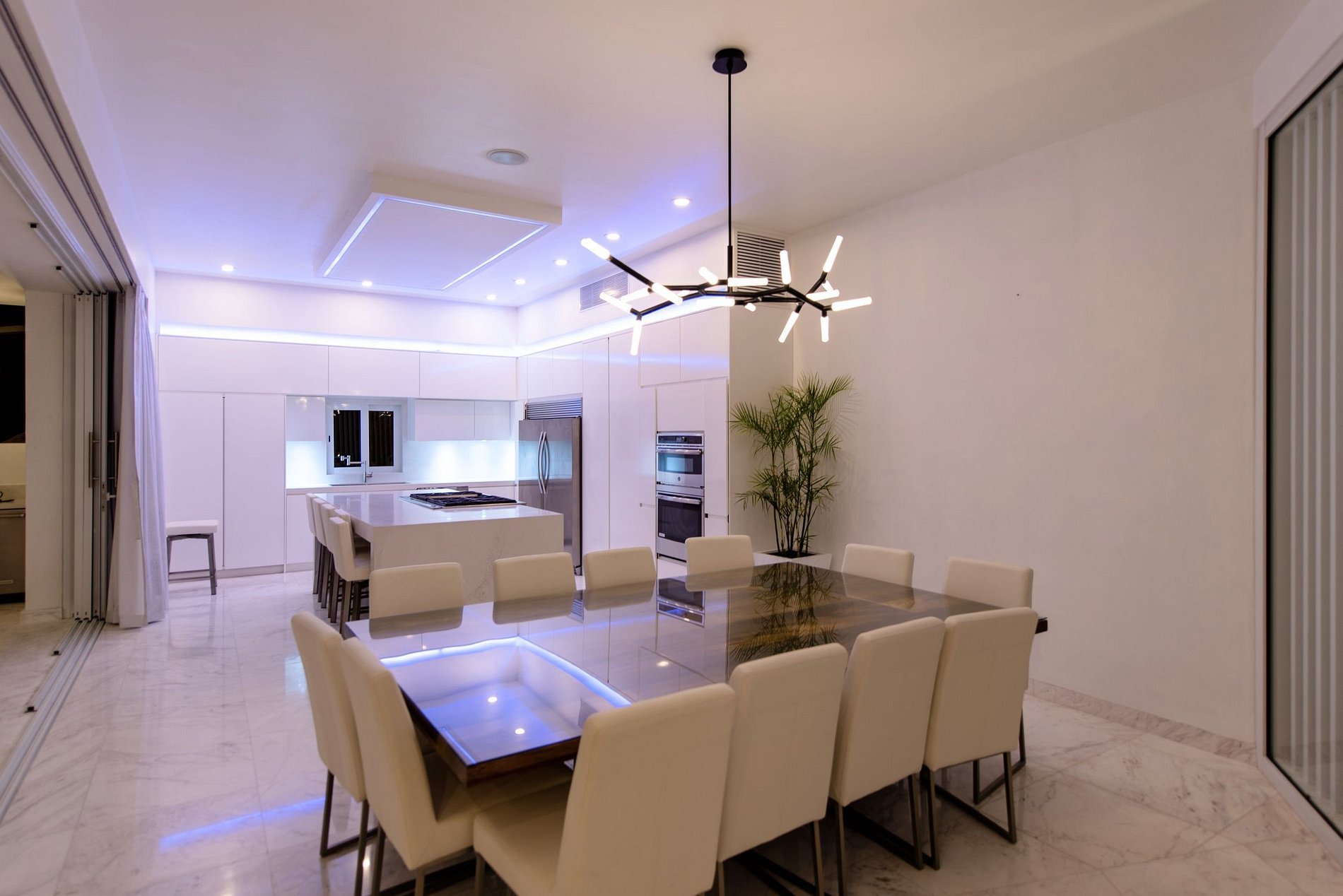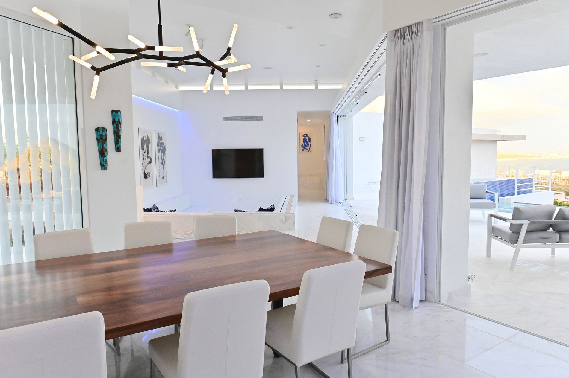 Su sala de televisión está cerca de la zona exterior y cuenta con un sofá en forma de U para disfrutar de agradables noches de televisión después de un día al sol. Su comedor, ubicado entre la sala de televisión y la cocina, cuenta con una mesa de comedor con capacidad para 10 personas cómodamente. La cocina está totalmente equipada con electrodomésticos modernos y un mostrador con una estufa, perfecta para que un chef privado cocine deliciosas comidas.