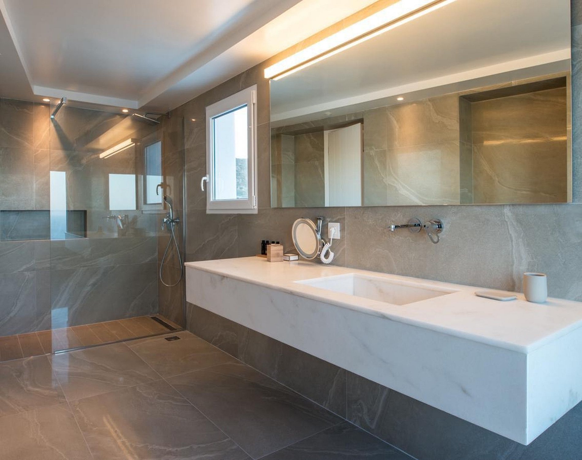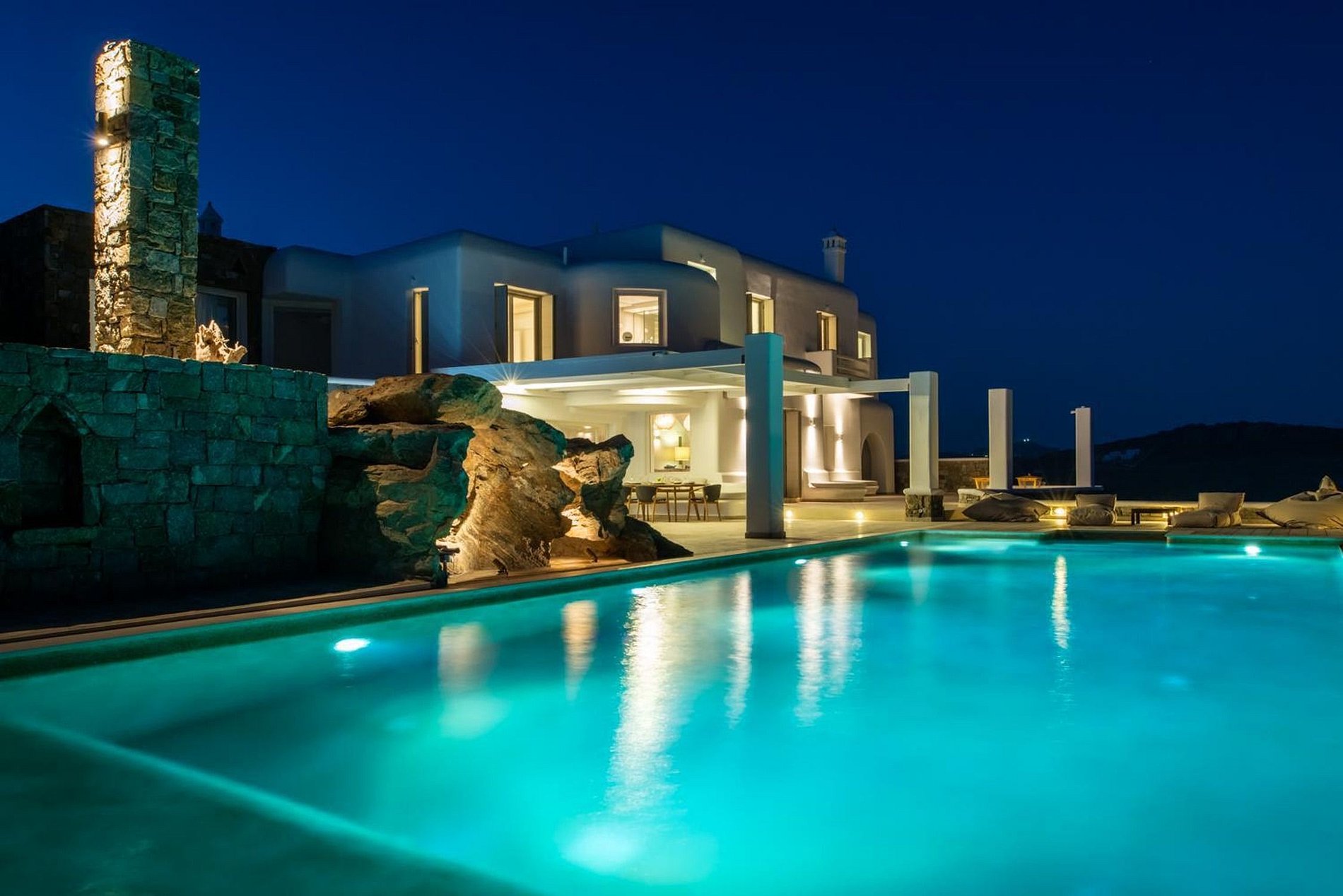 La villa se encuentra suspendida en el mismo borde de la orilla rocosa a menos de 300 metros de la famosa playa de Elia, consta de amplias salas de estar y terrazas con impresionantes vistas. Los interiores encalados, decorados con los más altos estándares, combinan el diseño contemporáneo con el arte y el lujo.
