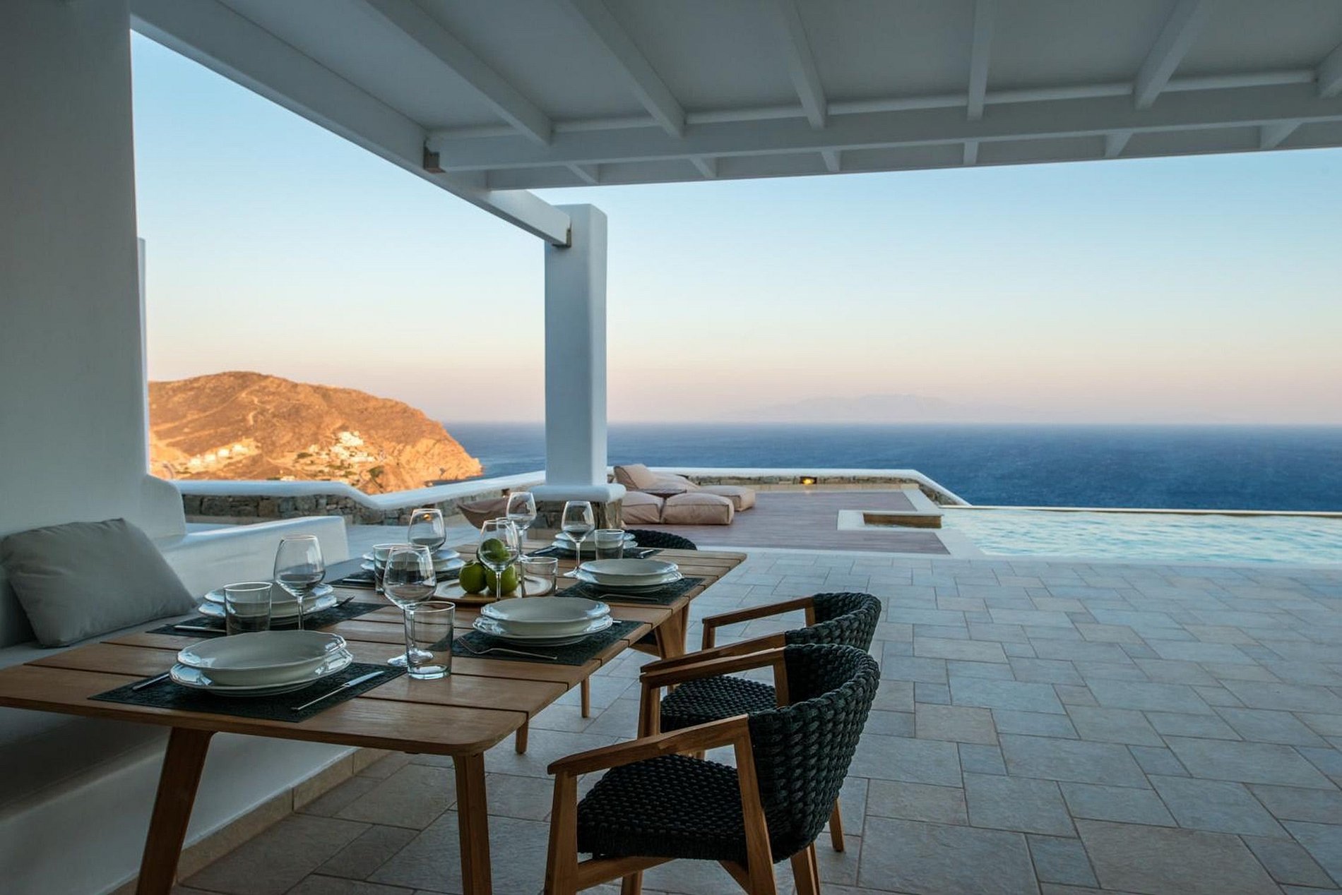 Esta lujosa villa construida ofrece una experiencia inigualable y cuenta con una de las vistas más magníficas del mar Egeo, las islas de Naxos y Paros, y la famosa playa de Elia, a menos de 300 metros de distancia.