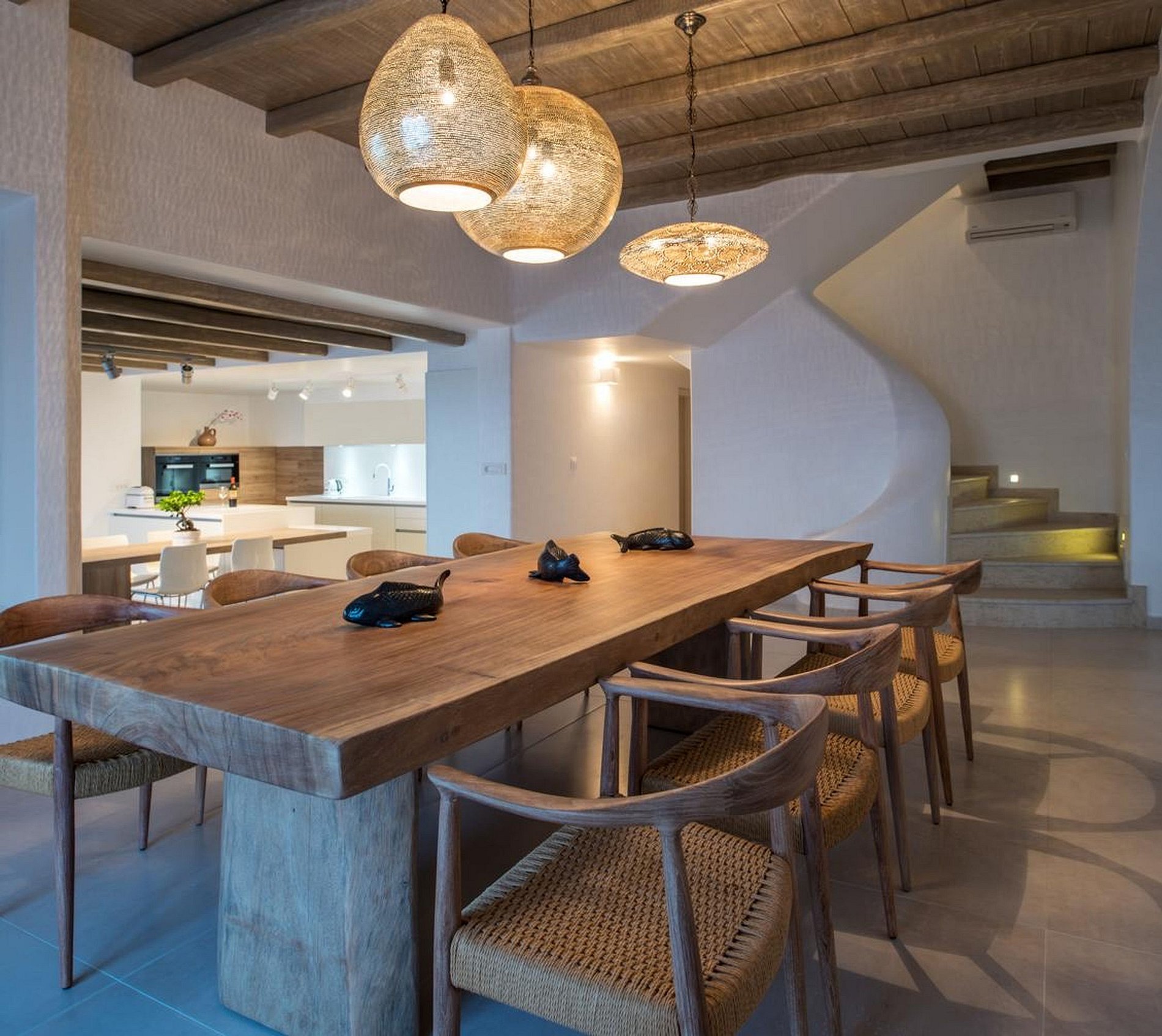 La villa se encuentra suspendida en el mismo borde de la orilla rocosa a menos de 300 metros de la famosa playa de Elia, consta de amplias salas de estar y terrazas con impresionantes vistas. Los interiores encalados, decorados con los más altos estándares, combinan el diseño contemporáneo con el arte y el lujo.