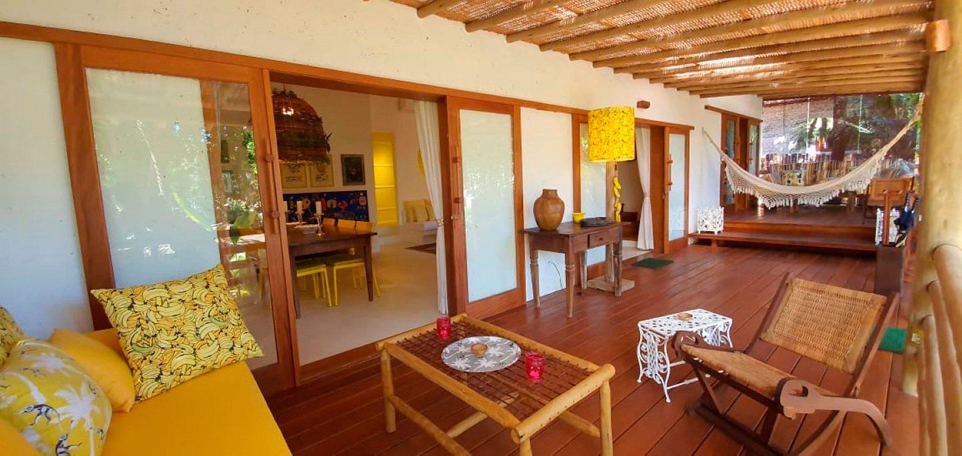 Al llegar a la casa, un gran balcón con 2 sofás lounge y una hamaca bahiana.