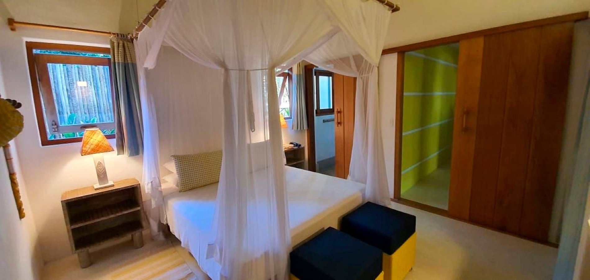 La entrada es a través de un exuberante y tranquilo jardín tropical lleno de pájaros de diferentes colores.