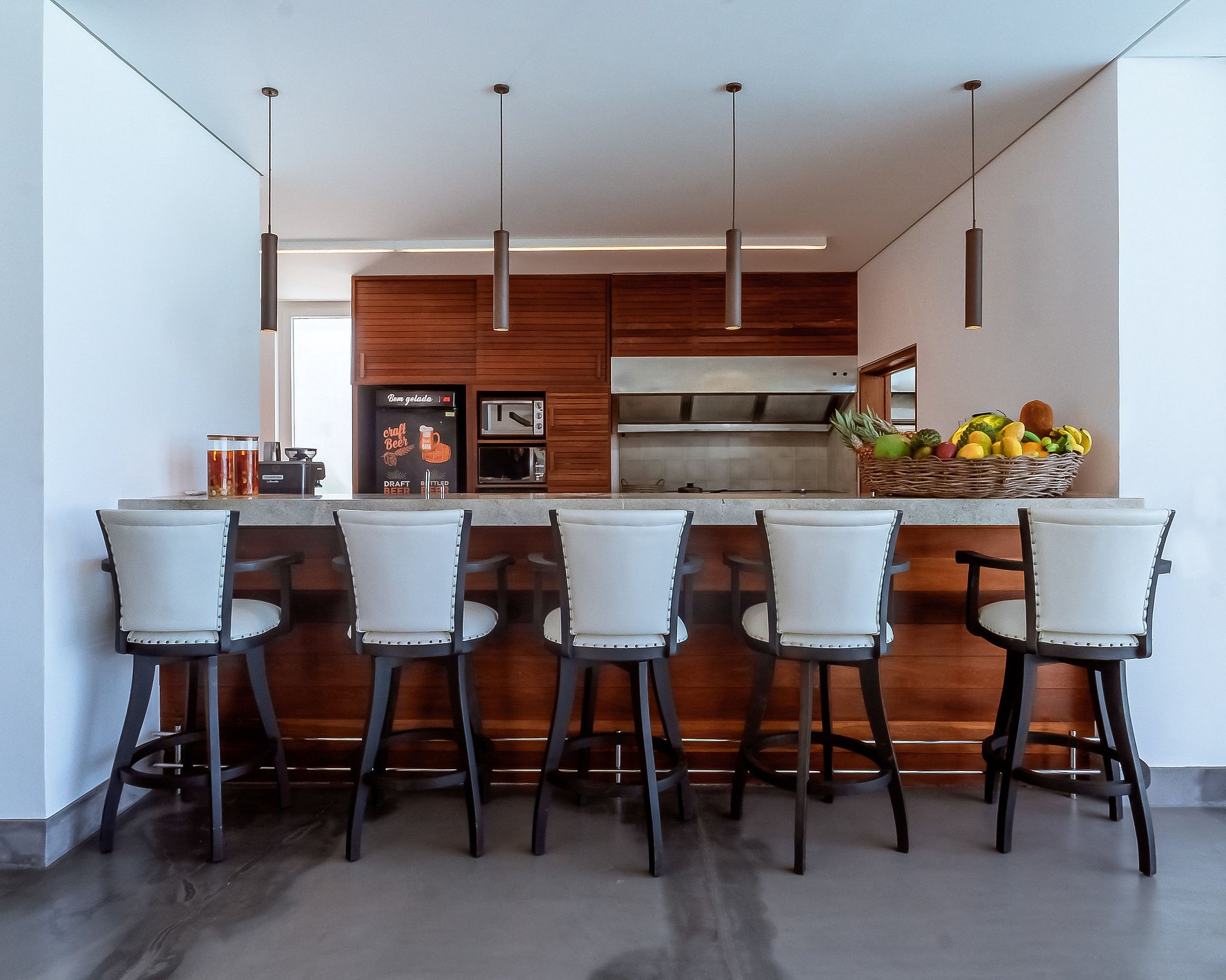 En la planta baja se encuentran: la sala, el comedor con dos hermosas mesas para comer y la cocina. La cocina está completa y preparada para atender a 20 personas diarias. La cocina cuenta con tres refrigeradores, 2 congeladores, cafetera, dos cocinas eléctricas, una cocina industrial y todo el equipamiento necesario. Adjunta a la cocina se encuentra la cocina gourmet que cuenta con asador eléctrico y una barra que da servicio al balcón y a la piscina. Excelente soporte para pequeños eventos, almuerzos o fiestas. Toda esta sala de estar interna está integrada en el área externa con puertas corredizas de vidrio. Hacer que la piscina grande y hermosa forme parte de la sala de estar. Bien decorado con sombrillas y tumbonas.