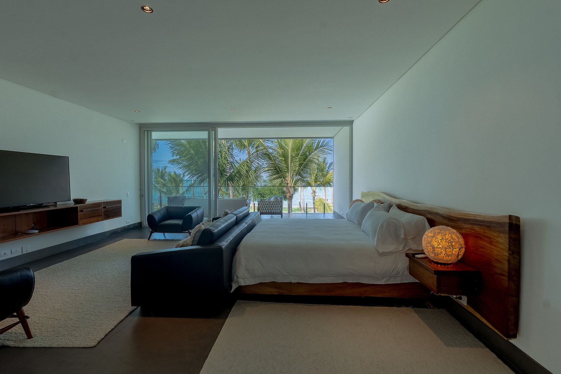 La casa principal, empezando por la planta superior con una superficie de 260M², se encuentran las dos master suites. Vista directa al mar, piscina y jardín. Cama king size, sillones o sofá, cortinas eléctricas, mesa de trabajo, SmartTV de 43” y aire acondicionado. El armario tiene una preciosa carpintería y es muy espacioso. Los baños cuentan con la individualidad de dos lavabos, dos duchas de 30 centímetros de diámetro y un jacuzzi para dos personas.