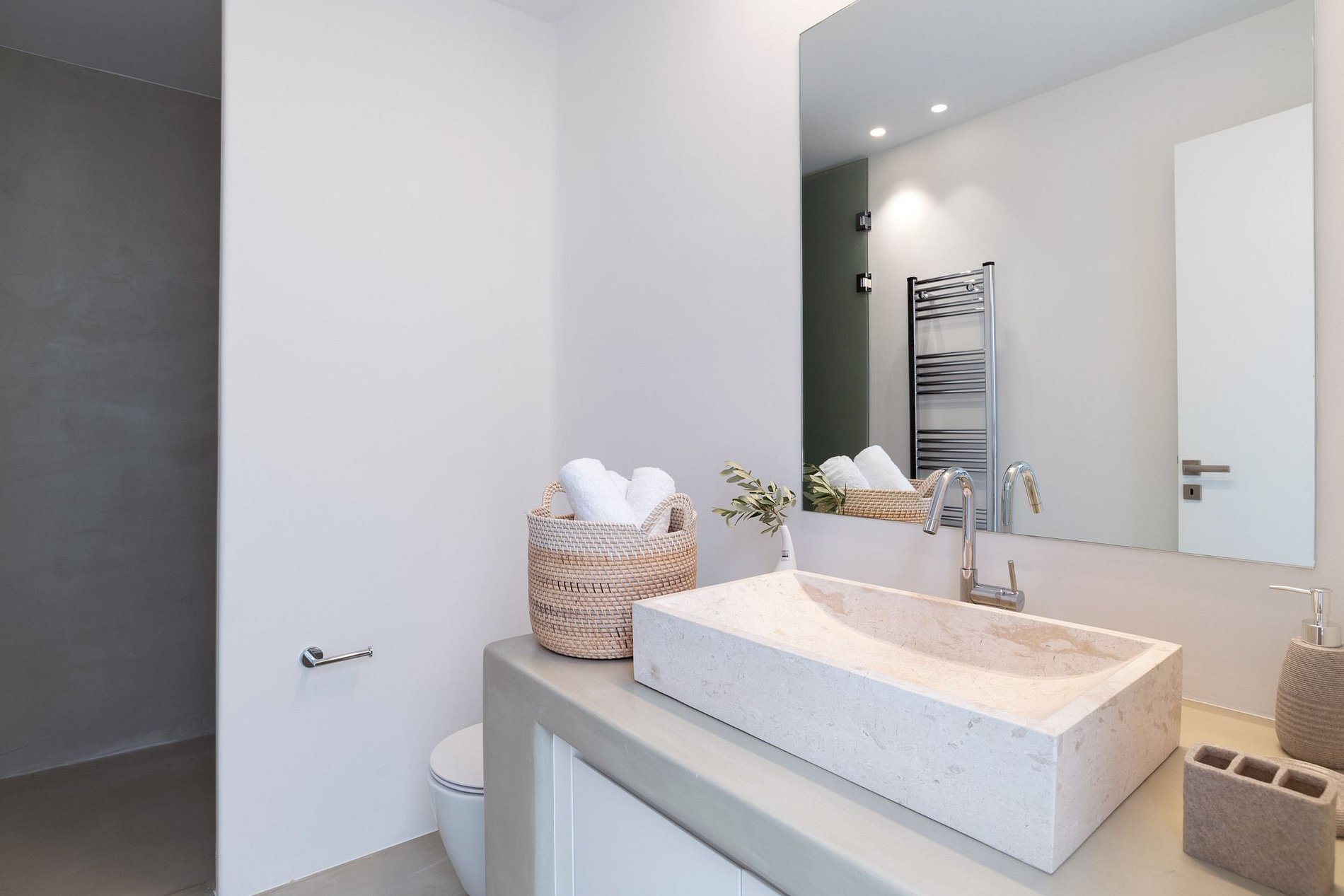La villa cuenta con un exterior blanco brillante parcialmente cubierto de piedra, una terraza con cómodos lugares para descansar y comer, una cocina al aire libre y una hermosa piscina infinita, todo con vista al mar con una vista increíble que cambia constantemente a medida que pasa el día.