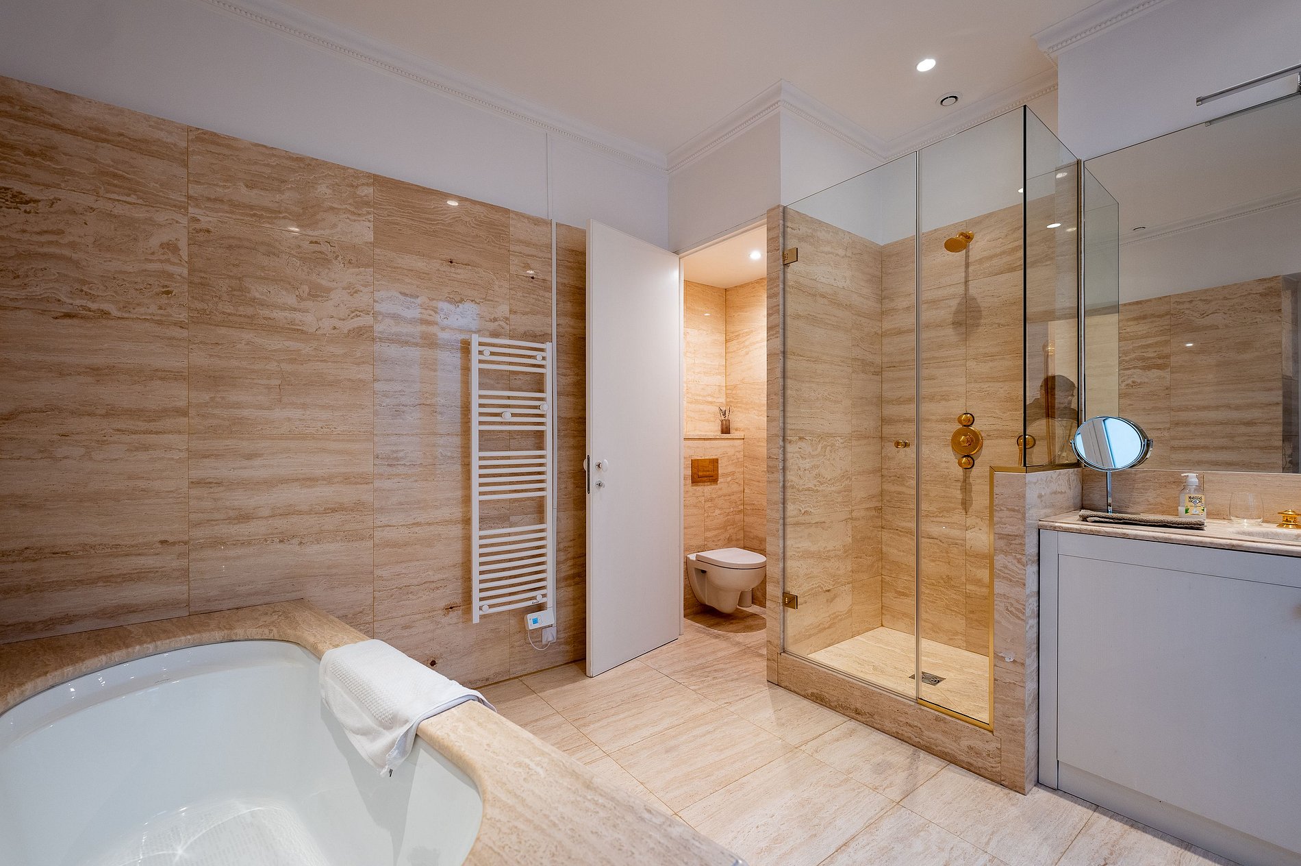 El dormitorio principal es un verdadero santuario de confort y estilo. Espacioso y bañado por suave luz natural, cuenta con una cama king-size, un gran vestidor y un opulento baño en suite con una bañera, ducha a ras de suelo y doble lavabo, perfecto para relajarse en total privacidad.
