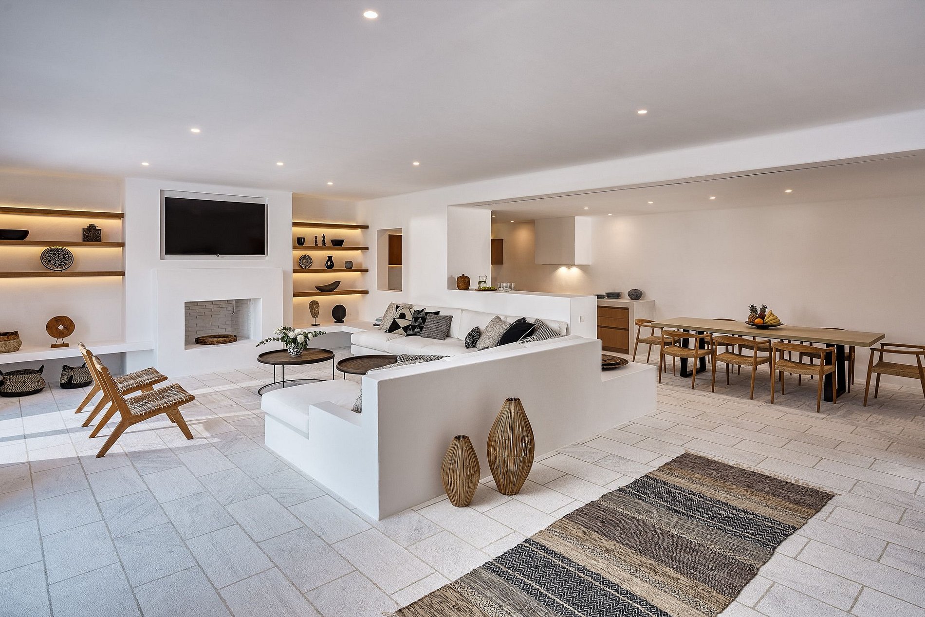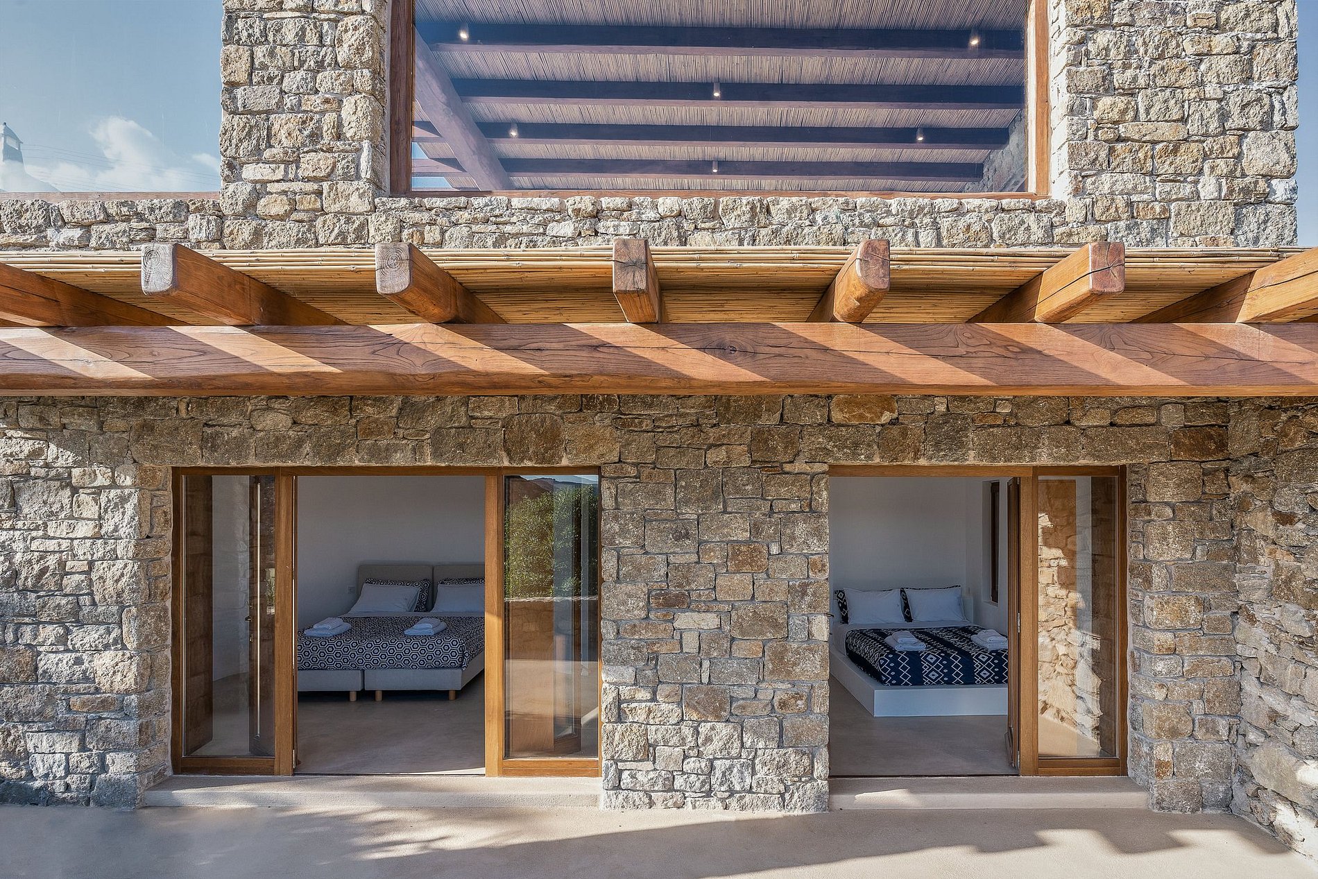 Los espacios interiores con las tradicionales paredes blancas están brillantemente resaltados por la madera dorada del piso y los techos altos con vigas a la vista. Los grandes ventanales del salón y las habitaciones dejan que el sol se extienda sobre los sofás y las camas. Todas las habitaciones tienen vistas despejadas al mar, mientras que los 3 niveles tienen sus propios patios / terrazas y acceso directo a la piscina.