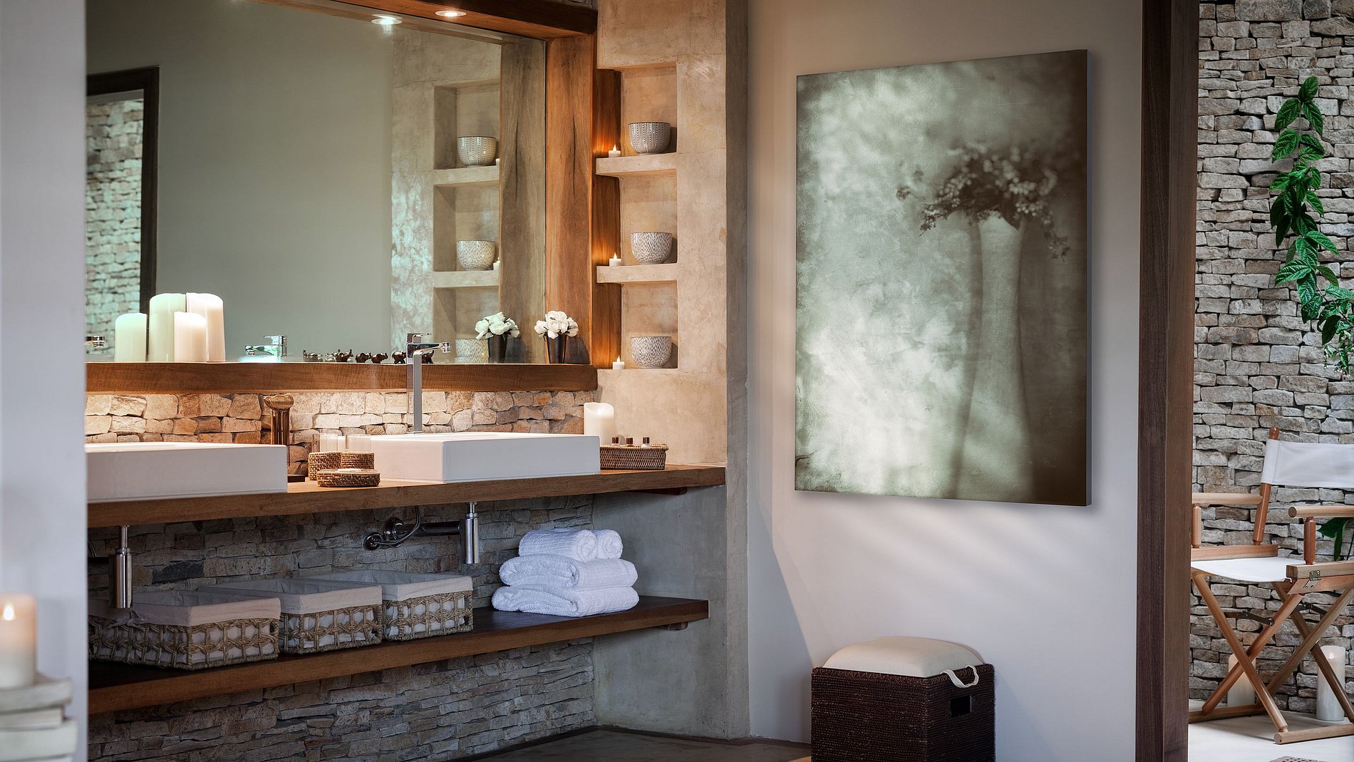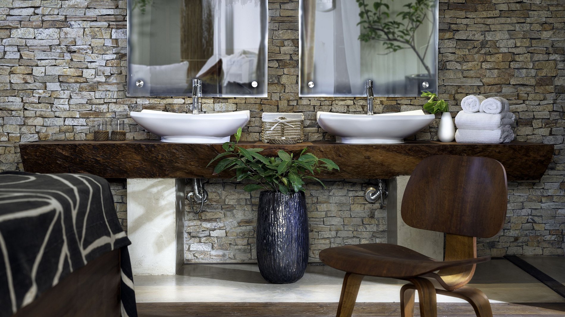 La suite de 22m2 tiene una cama de 1,60 m de ancho, amplios baños y armario. La decoración se debe a las hermosas lámparas y paredes de piedra natural que le dan el sofisticado tono rústico.