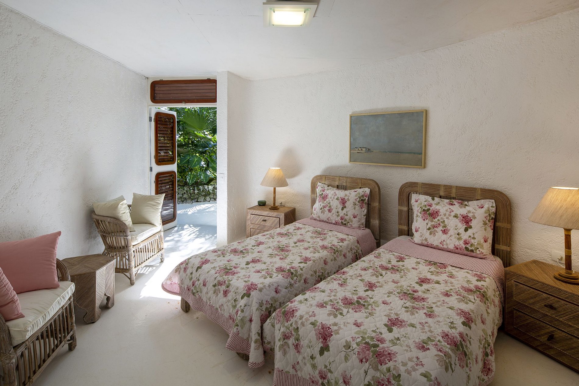 Suite 4: Suite independiente con salón y aire acondicionado, 2 camas individuales, 2 mesitas de noche, TV y baños sencillos con lavabo y bidet.