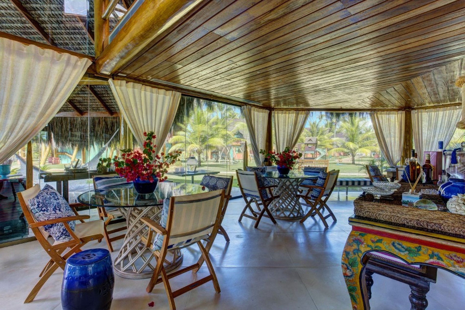 La propiedad cuenta con increíbles chalets con su estructura y acabado en madera pulida y techo de madera cubierto con paja en el exterior, lo que le da a los chalets un hermoso aspecto costero. El chalet principal está ubicado en el centro de la isla, tiene 2 plantas, aire acondicionado central, sistema de sonido incorporado para eventos musicales o fiestas y tiene en la planta baja sus dos salas de estar, la sala en un área abierta frente a la piscina. y la segunda sala en área cerrada perfectamente decorada con muebles selectos y amplia mesa comedor de 12 plazas. En el segundo piso hay una sala de juegos con mesa de billar, ping pong y futbolín.