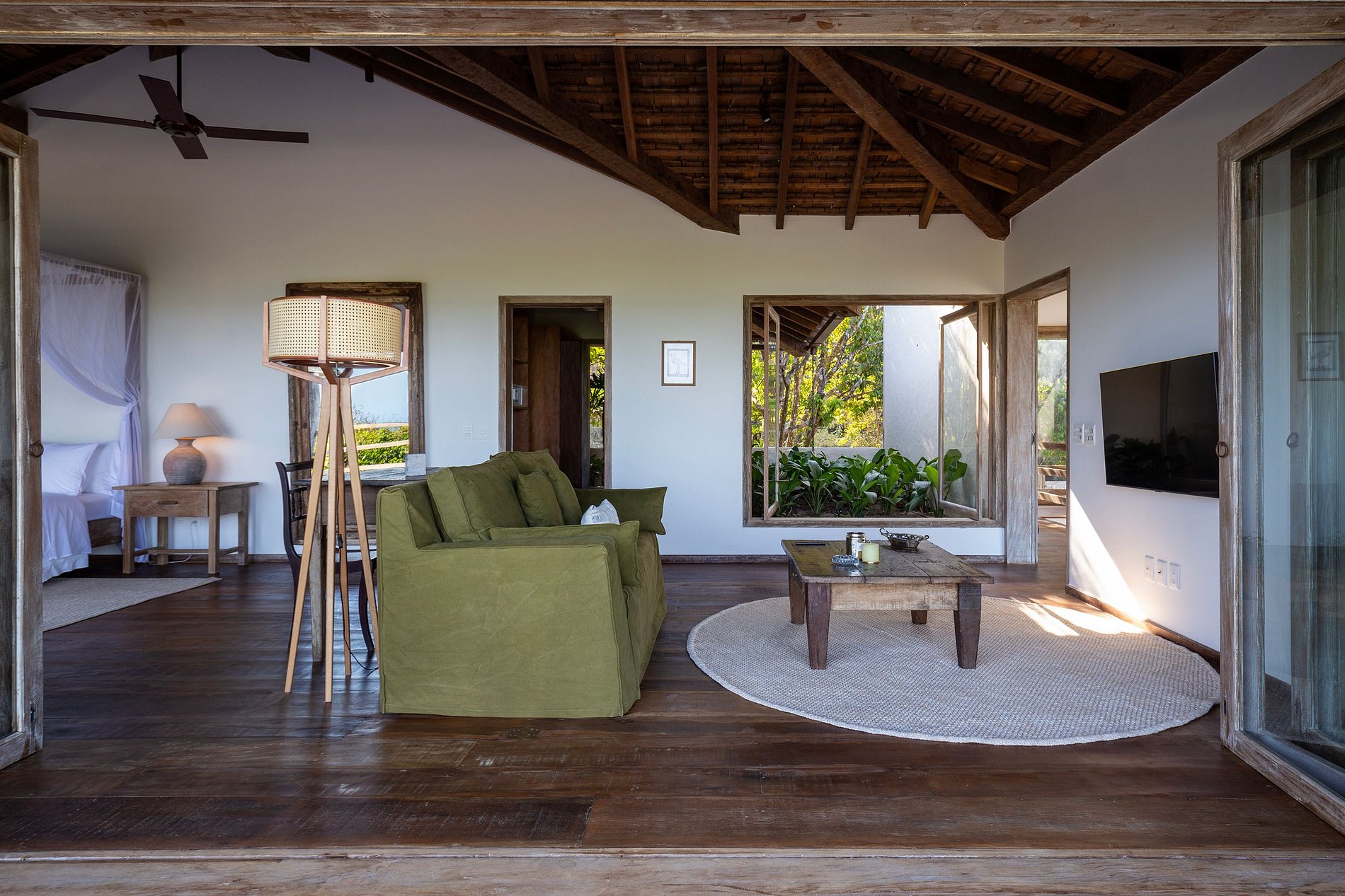 La sala de estar y el comedor son espacios integrados con grandes ventanales que permiten la entrada de luz natural, conectando a los huéspedes con el entorno exterior. Con muebles elegantes y decoración que refleja el estilo rústico-chic típico de Trancoso, estos espacios son perfectos para socializar y disfrutar de comidas con vista al mar. La casa también ofrece ventiladores de techo, ropa de cama de primera calidad, y mesas para comer al aire libre, creando una atmósfera de confort y elegancia.