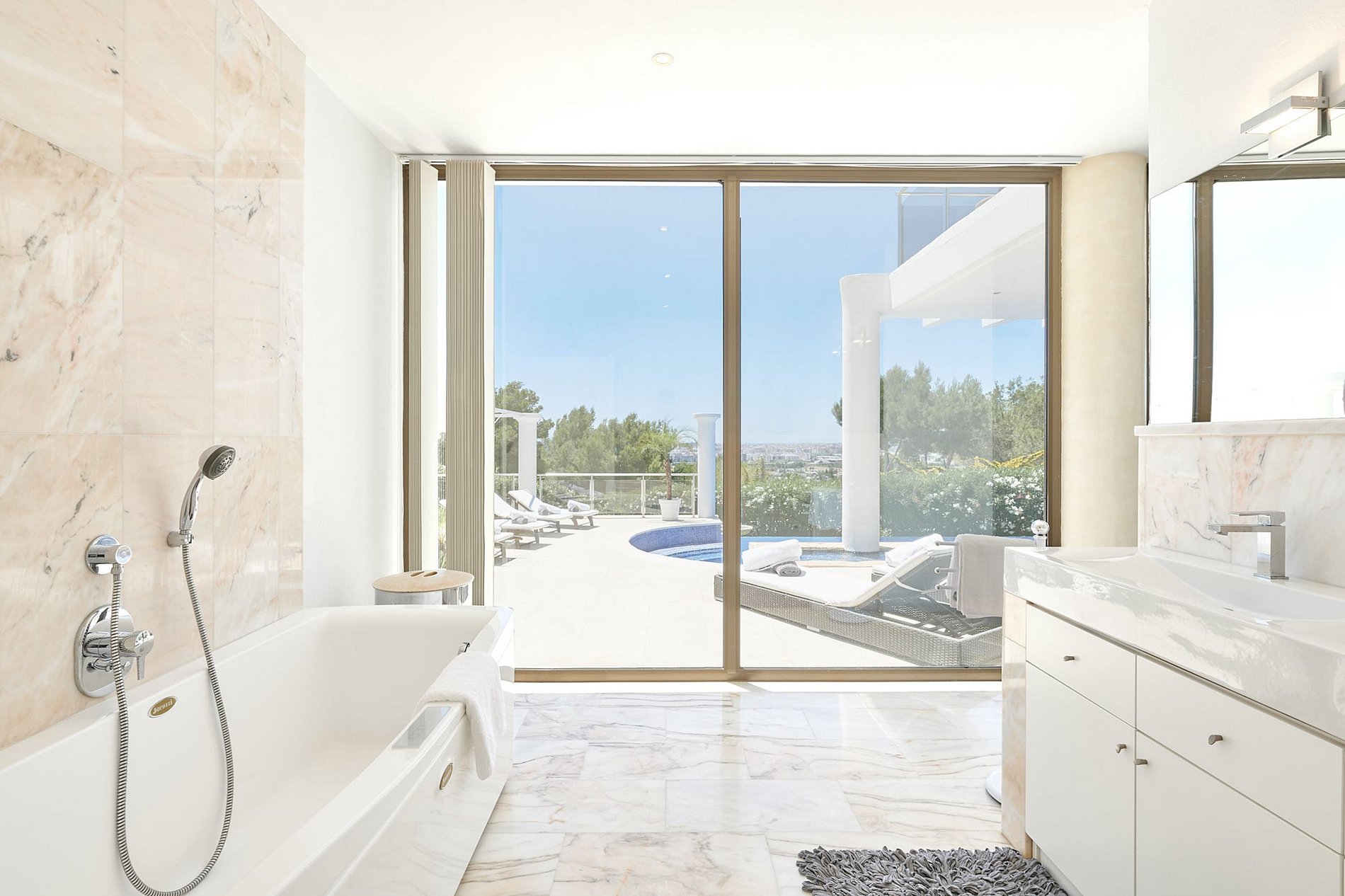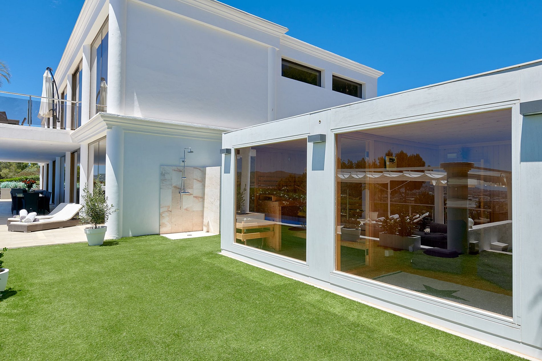 La zona exterior de la villa ofrece muchas posibilidades para pasar el tiempo en el hermoso jardín o en la sauna junto a la piscina. Todas las terrazas tienen áreas de descanso con una vista increíble de la ciudad de Ibiza y el Mediterráneo.