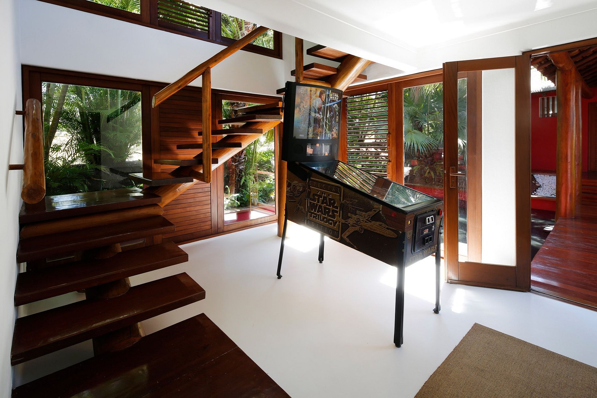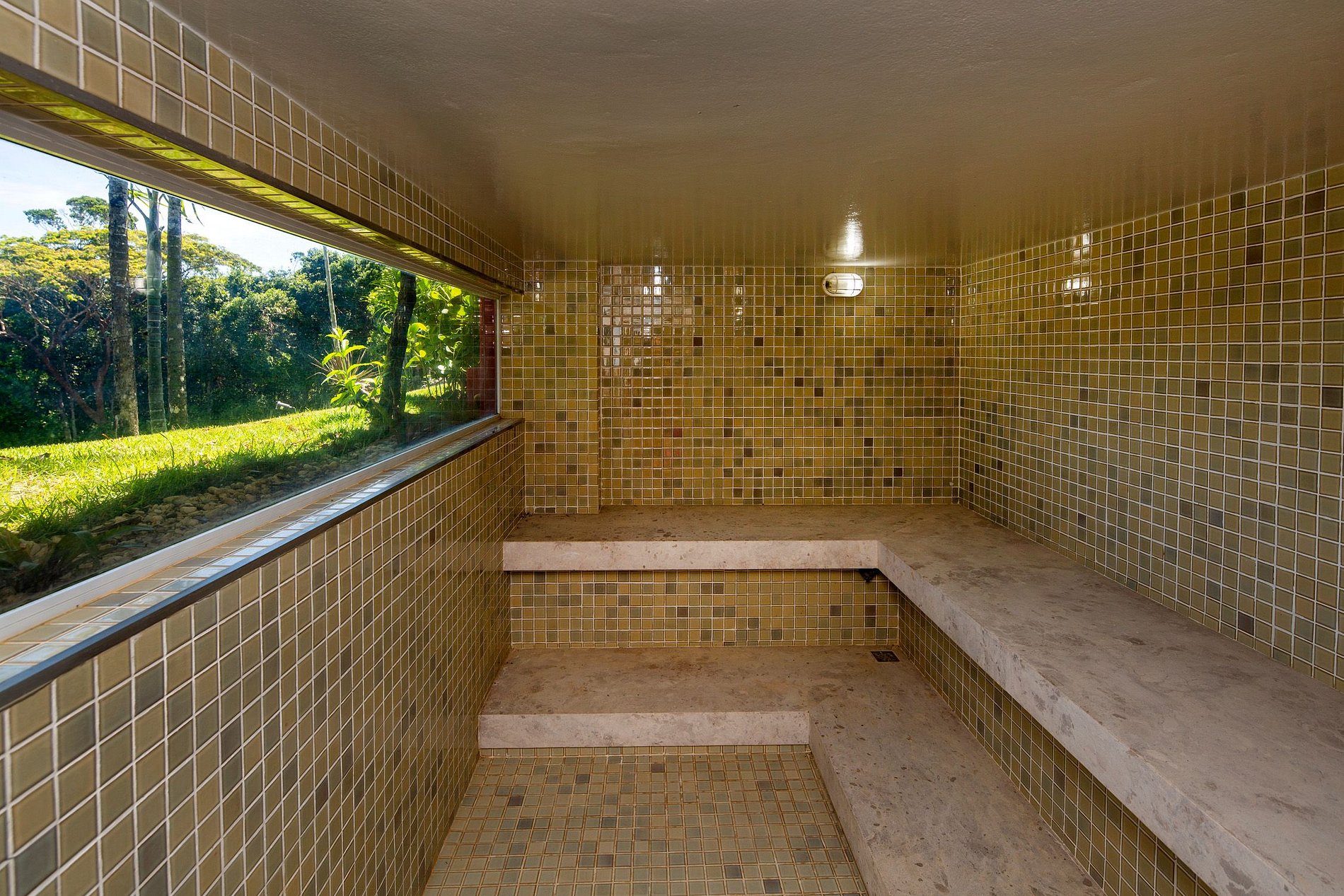 Entre todos los atractivos, la casa posee una piscina infinita, sauna y áreas sociales internas y externas amplias y abiertas para más contacto con la naturaleza exuberante del local.