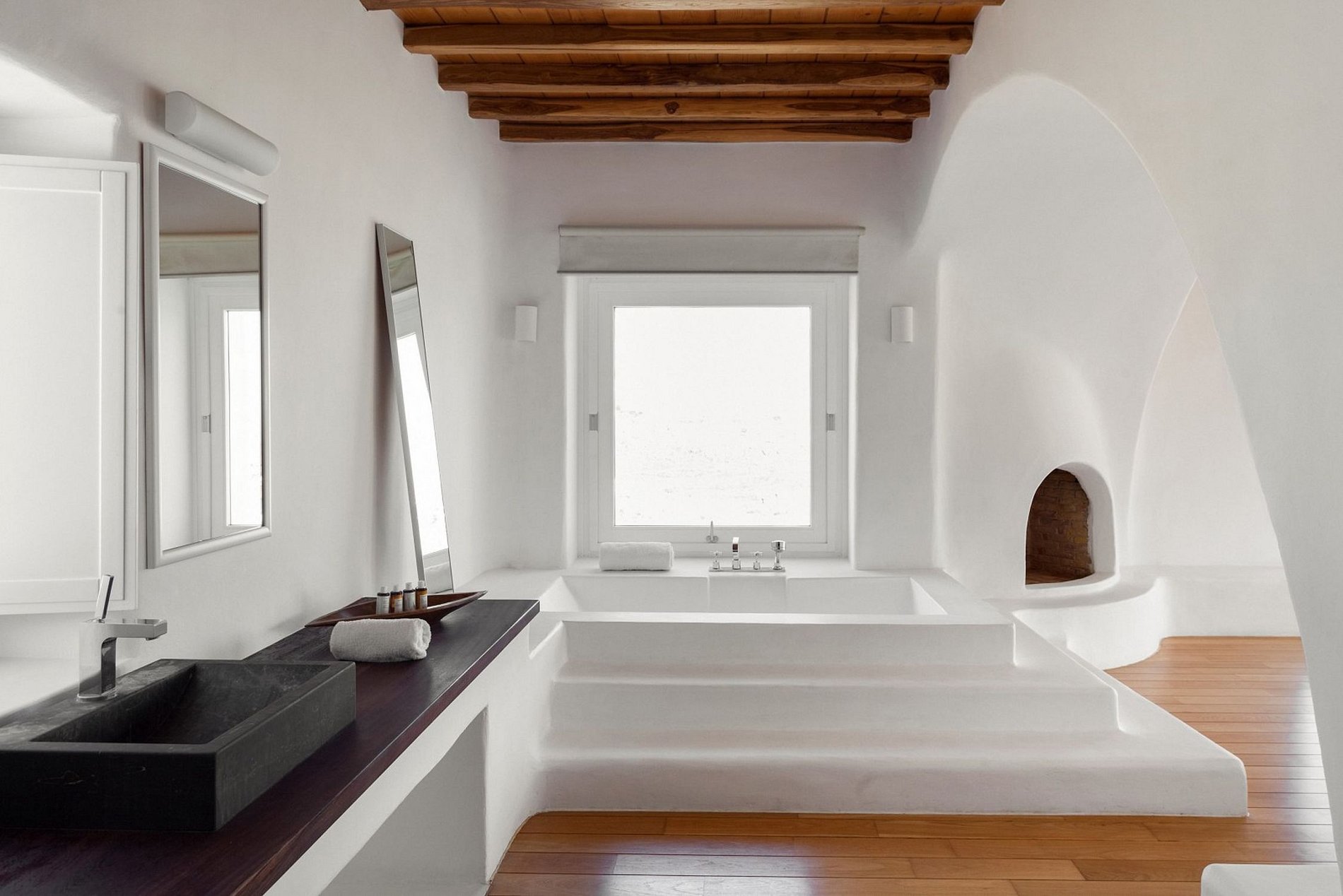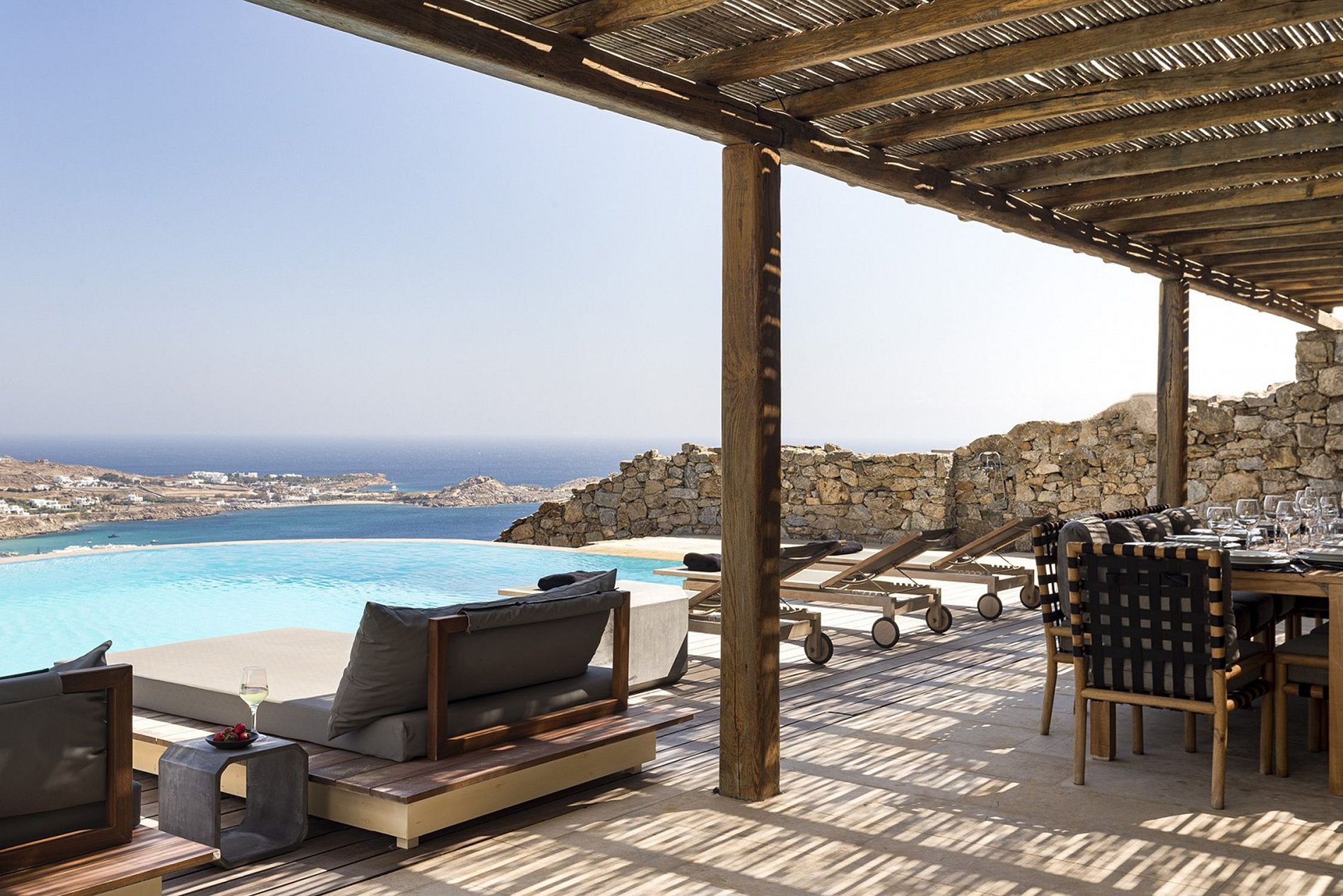 El comedor al aire libre pero a la sombra rodeado por la piscina, ofrece a los huéspedes momentos infinitos de relajación bajo el cálido sol o por la noche bajo la iluminación efectiva de las estrellas y las luces brillantes de la famosa bahía de Psarou. La ubicación distintiva ofrece muchas instalaciones y un área de estacionamiento disponible.