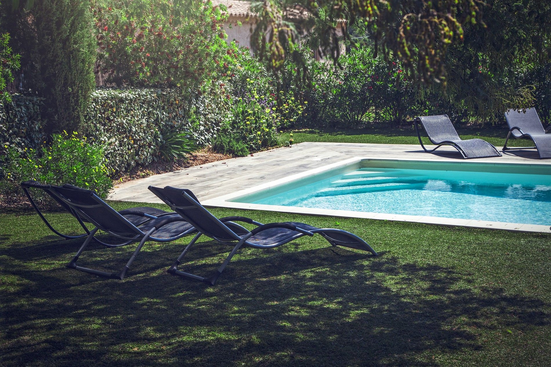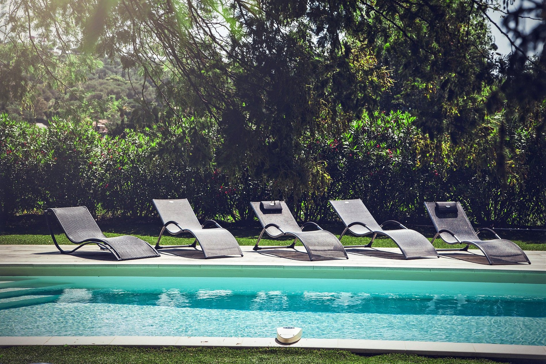 La villa est entourée de magnifiques arbres ce qui permet de bien séparer la propriété des autres maisons et dispose d'un beau jardin avec une grande piscine et de confortables chaises longues pour se détendre au soleil et bronzer.