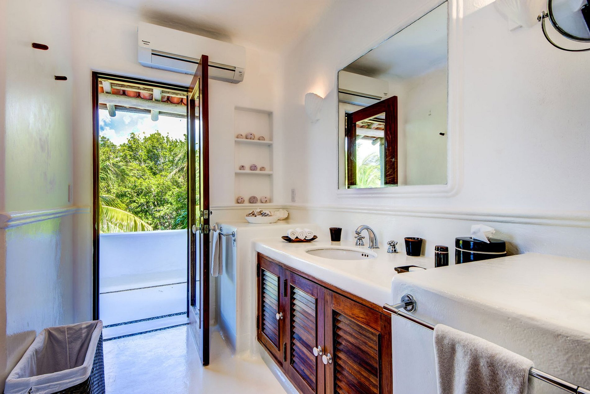 El área de la piscina conduce a la playa, donde se encuentra el quiosco privado, rodeado de palmeras tropicales. Durante los meses de junio y julio, las especies protegidas de tortugas marinas gigantes vienen a desovar en la playa. Se hace un gran esfuerzo para mantener sus jardines lo más impecables posible. Varias especies de árboles y plantas tropicales, a menudo visitadas por pájaros coloridos, rodean la casa. Una piscina natural (cenote) separa el césped de una hermosa línea de árboles de la selva. Dependiendo de la época del año, es posible nadar en este cenote privado.
