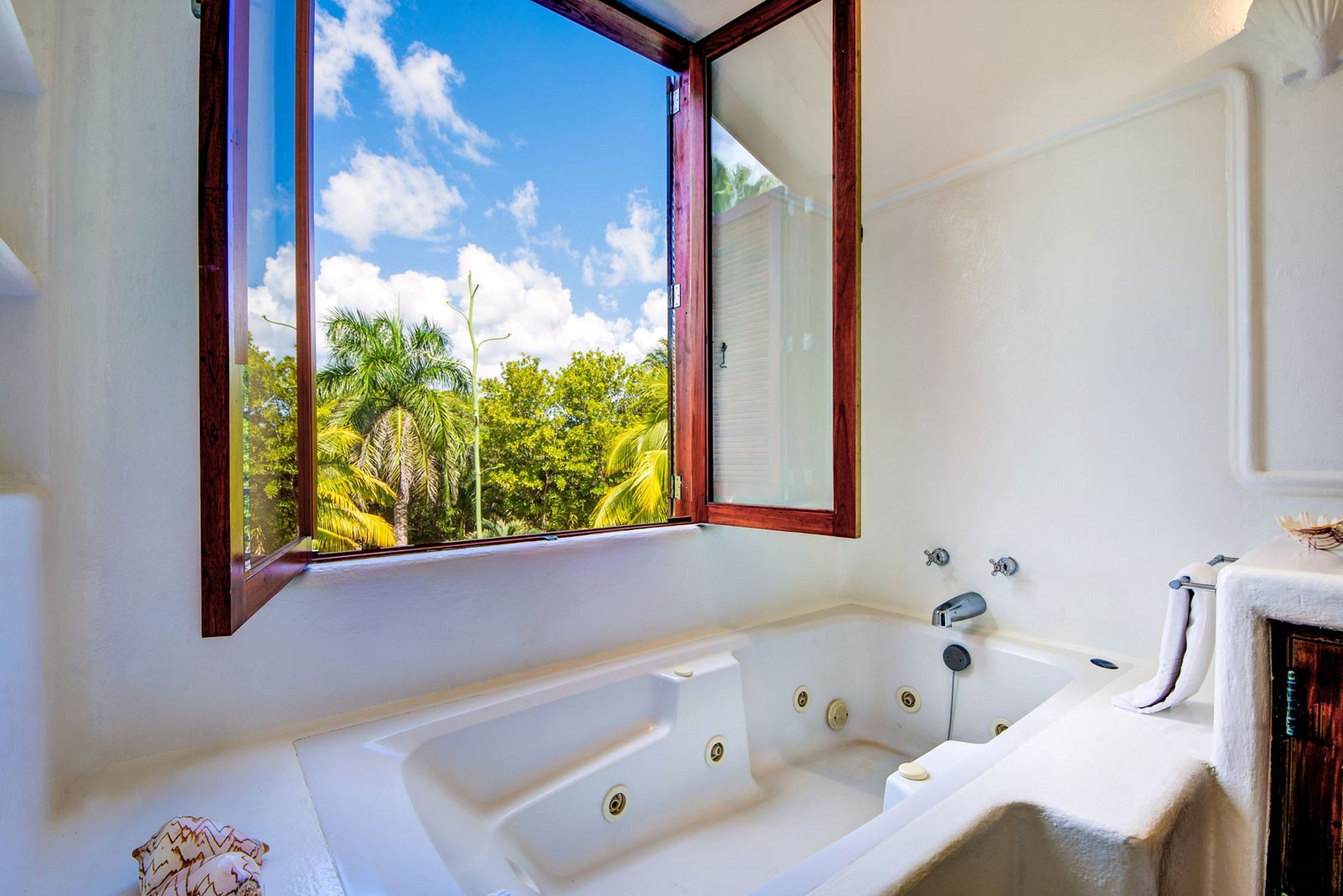 El área de la piscina conduce a la playa, donde se encuentra el quiosco privado, rodeado de palmeras tropicales. Durante los meses de junio y julio, las especies protegidas de tortugas marinas gigantes vienen a desovar en la playa. Se hace un gran esfuerzo para mantener sus jardines lo más impecables posible. Varias especies de árboles y plantas tropicales, a menudo visitadas por pájaros coloridos, rodean la casa. Una piscina natural (cenote) separa el césped de una hermosa línea de árboles de la selva. Dependiendo de la época del año, es posible nadar en este cenote privado.