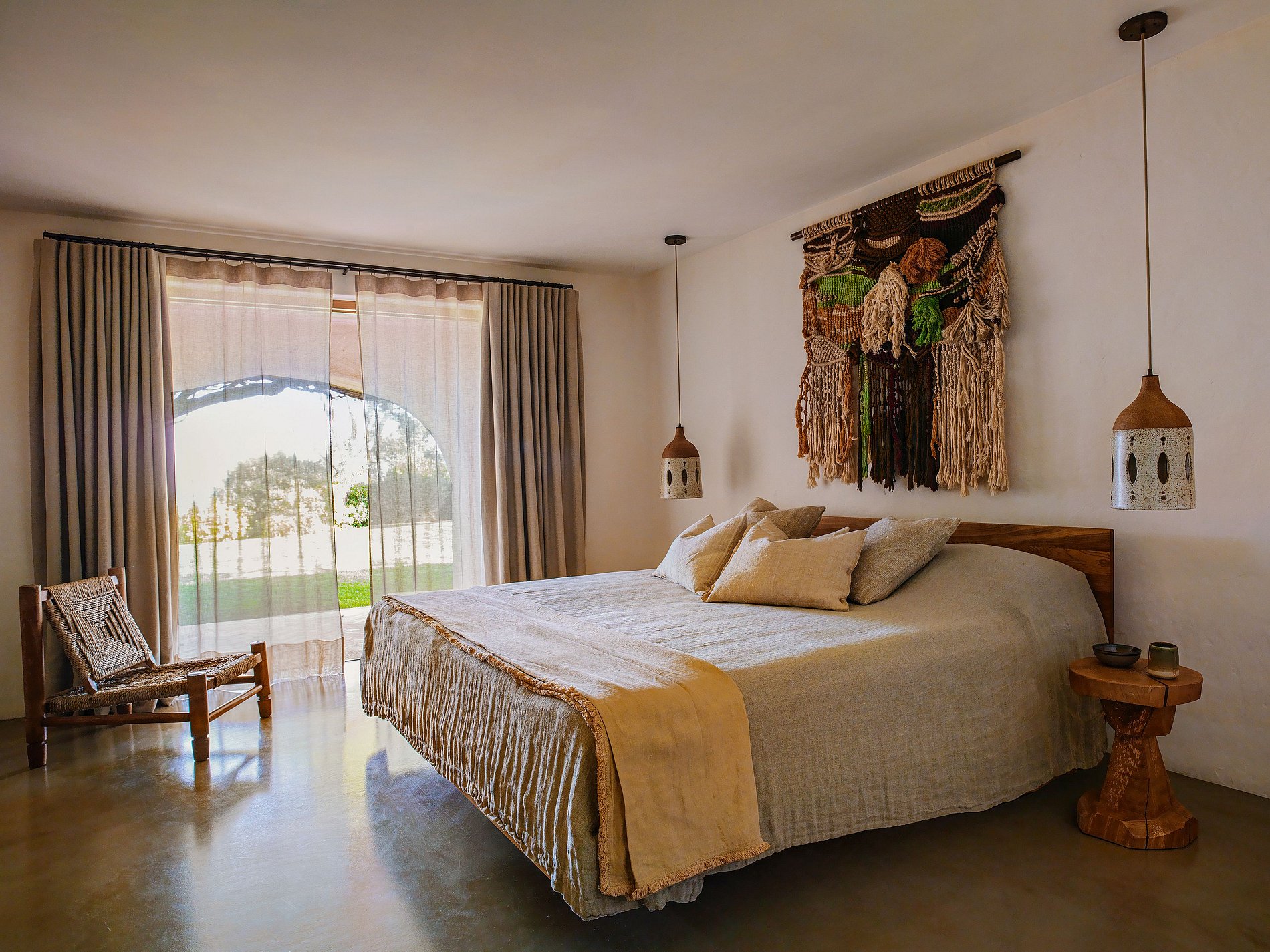 La villa también cuenta con un espacio de servicio completamente renovado, que ofrece dos suites adicionales decoradas en el mismo estilo hippie chic refinado que el resto de la propiedad. Estas suites garantizan confort y privacidad para el personal o para invitados adicionales. Cada una dispone de un baño privado y todo lo necesario para una estancia agradable y sin preocupaciones.