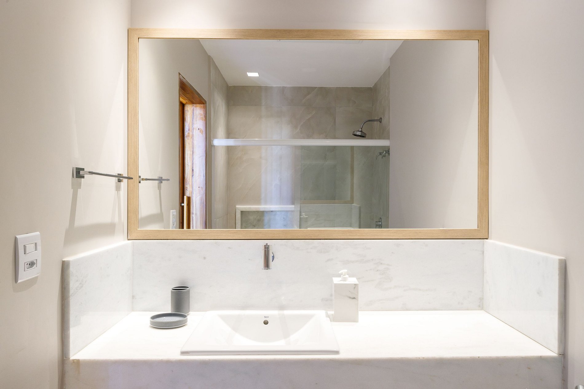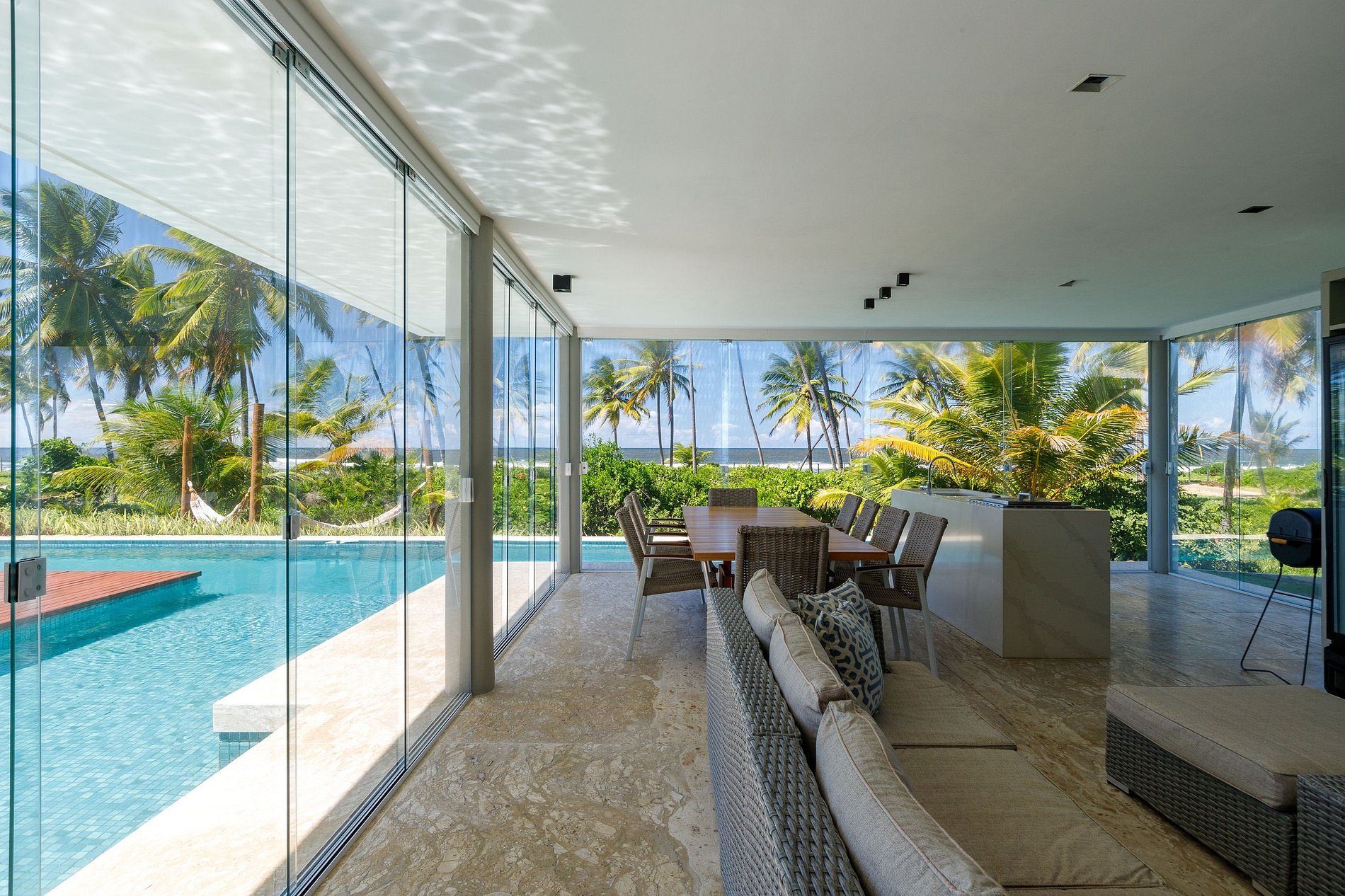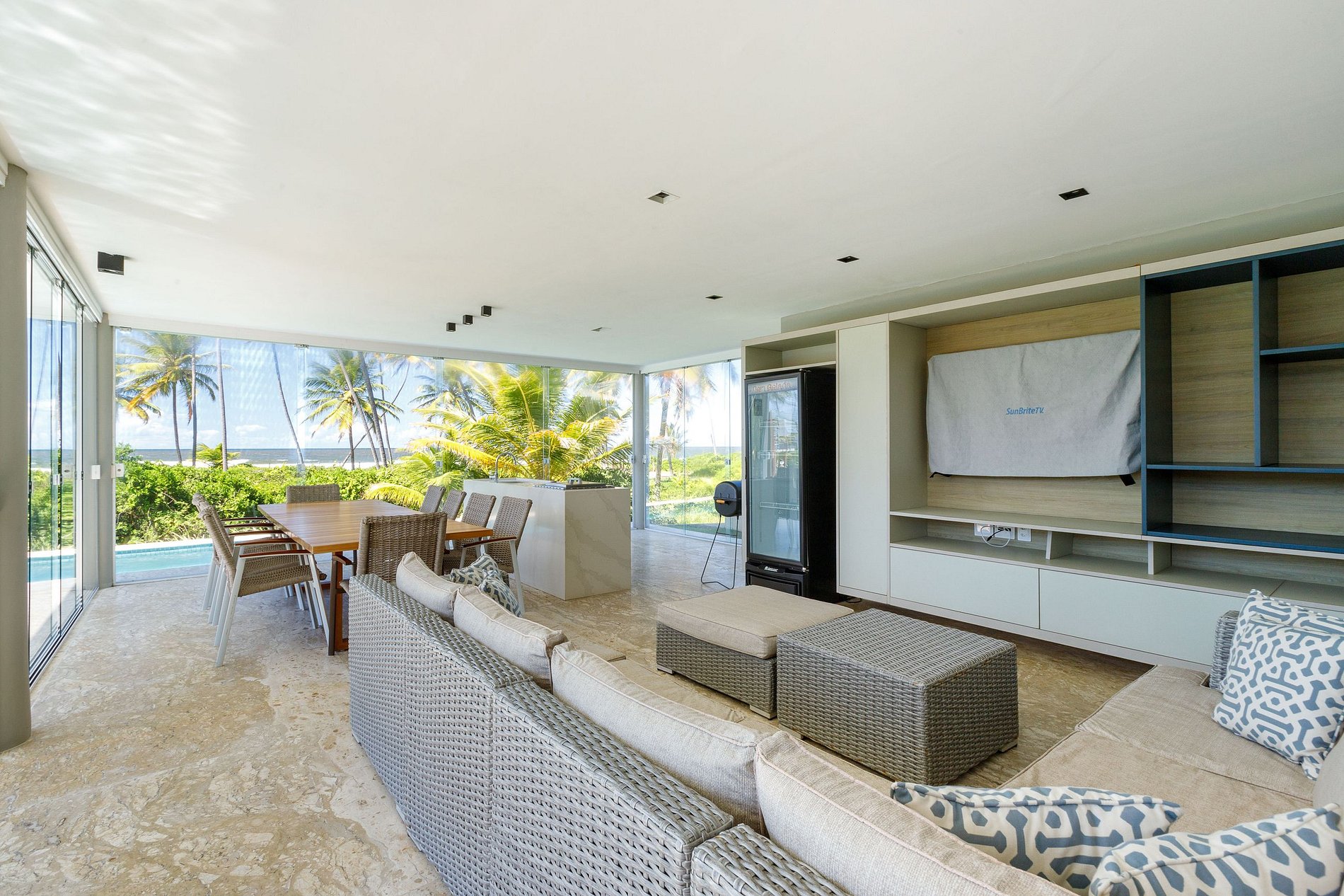 La casa fue planeada en un concepto abierto para aprovechar al máximo la luz solar. En el primer piso de la casa se encuentra el gran espacio que reúne 2 salas con smart TV, 2 comedores y cocina, todo el ambiente cuenta con aire acondicionado central y vista al área externa.