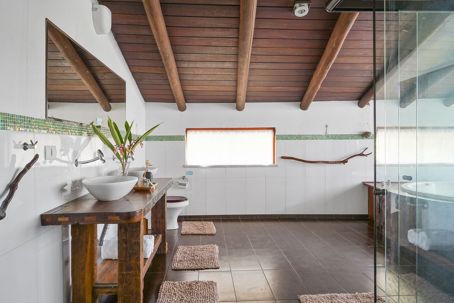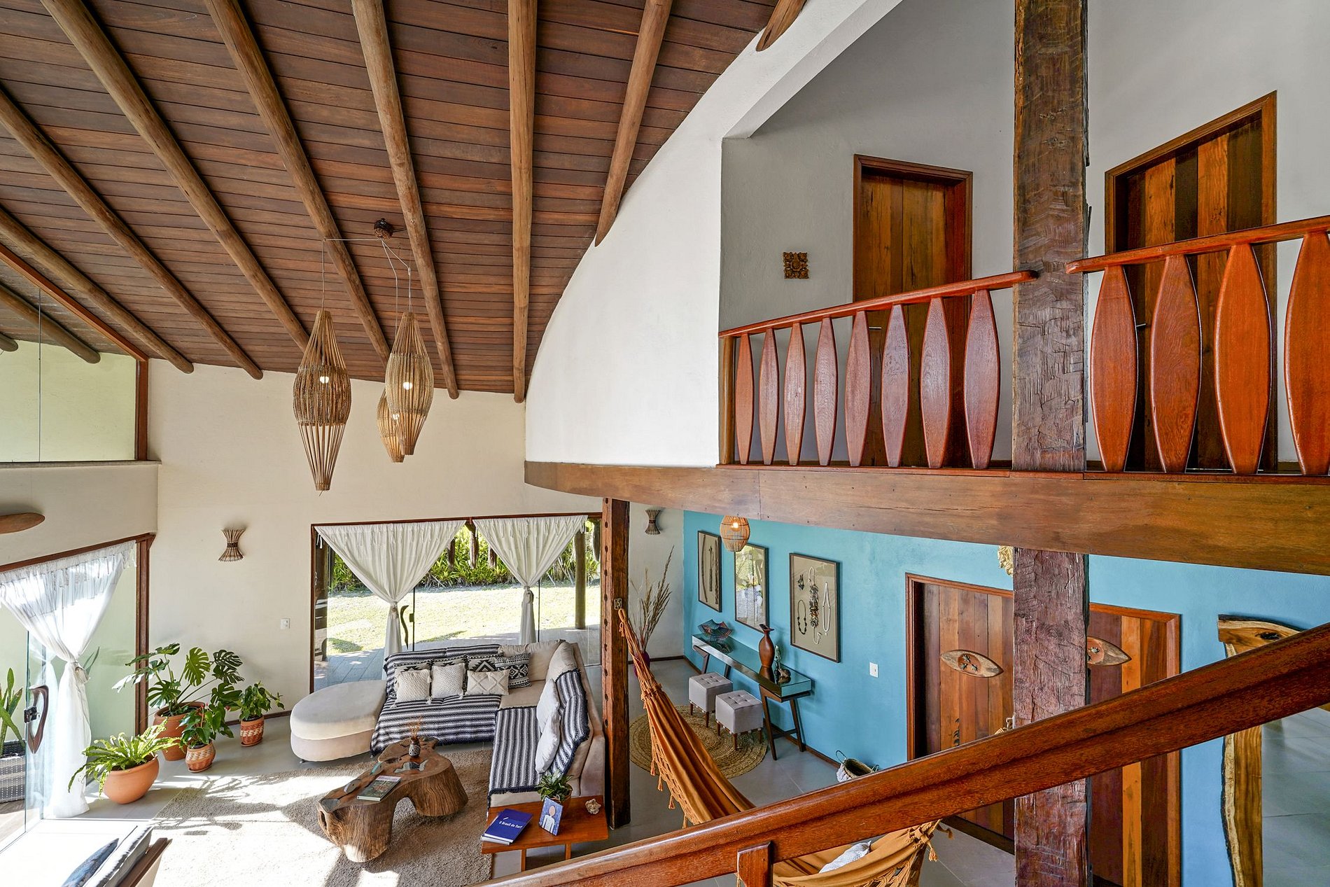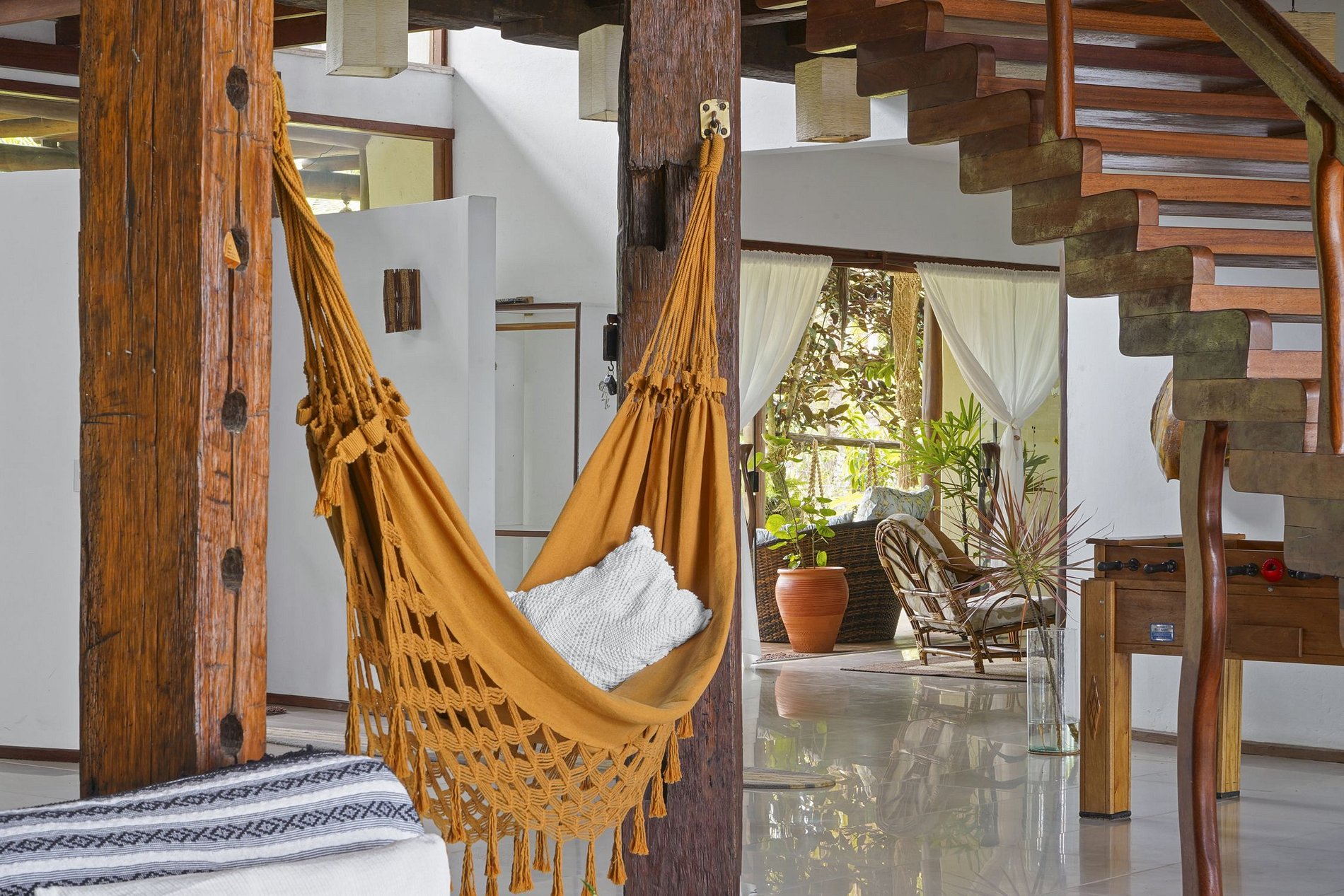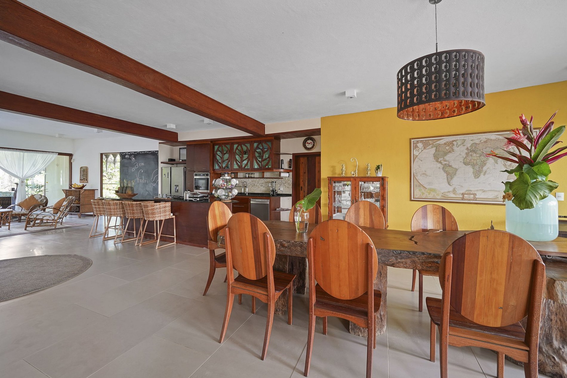 La casa se divide en 2 plantas. Justo en el hall de entrada, una vista de la imponente escalera de madera, un moderno modelo victoriano curvo. En la planta baja se encuentra el gran salón, amueblado con muebles seleccionados y decorado con bellos elementos de artesanía local. La sala de televisión con cómodos sofás y una gran smart tv para disfrutar de películas y series. El comedor es muy espacioso. y destaque para la mesa de comedor, realizada en madera cruda con capacidad para 8 comensales. La cocina está bien equipada con electrodomésticos.