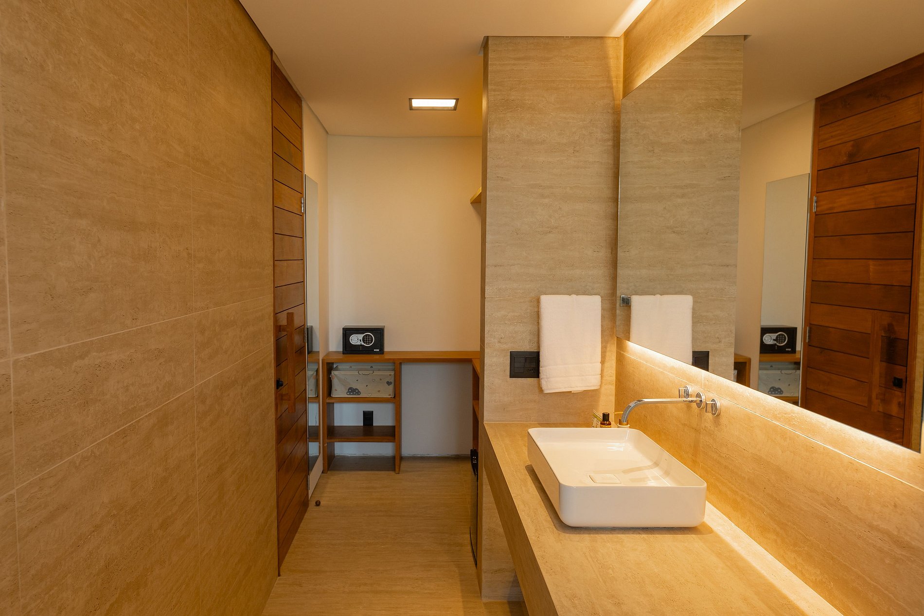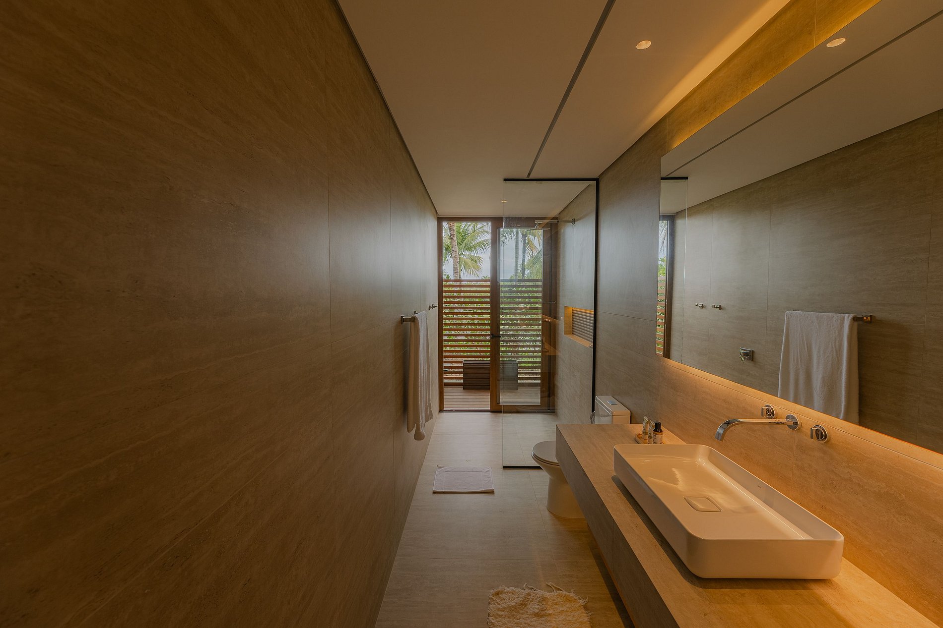 La residencia tiene un frente de 30 m3 y un lado de 40 m, totalizando 70 m, y se distribuye en 2 plantas, con cochera techada para 2 autos, hall de entrada, sala, cine en casa, comedor, amplia cocina, lavandería. , 10 baños (incluidos los de las suites). El Área Externa consta de una cocina gourmet,