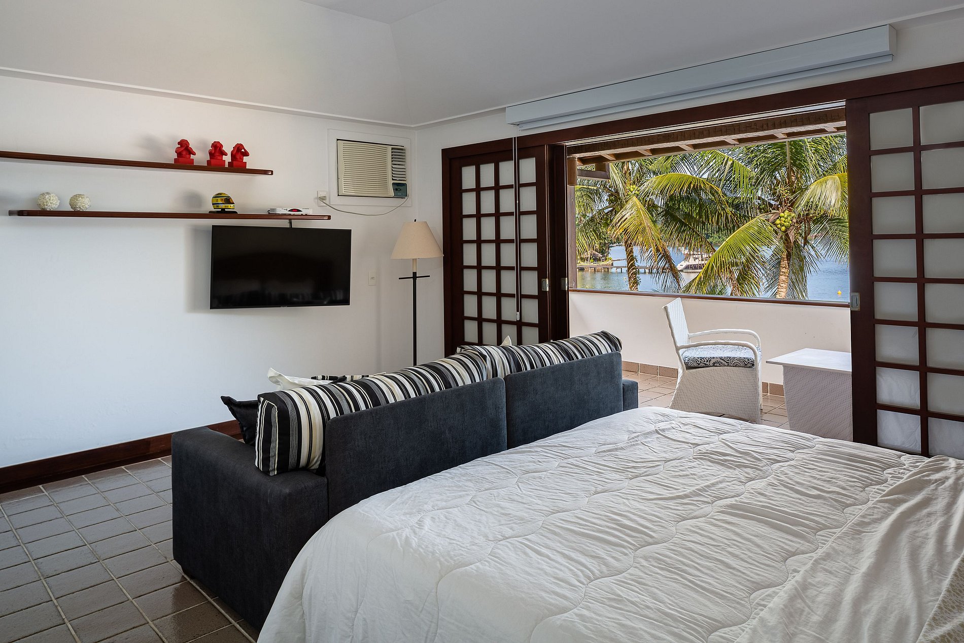 Suite 2 con cama queen, TV por cable, aire acondicionado, sofá cama y vista al mar.