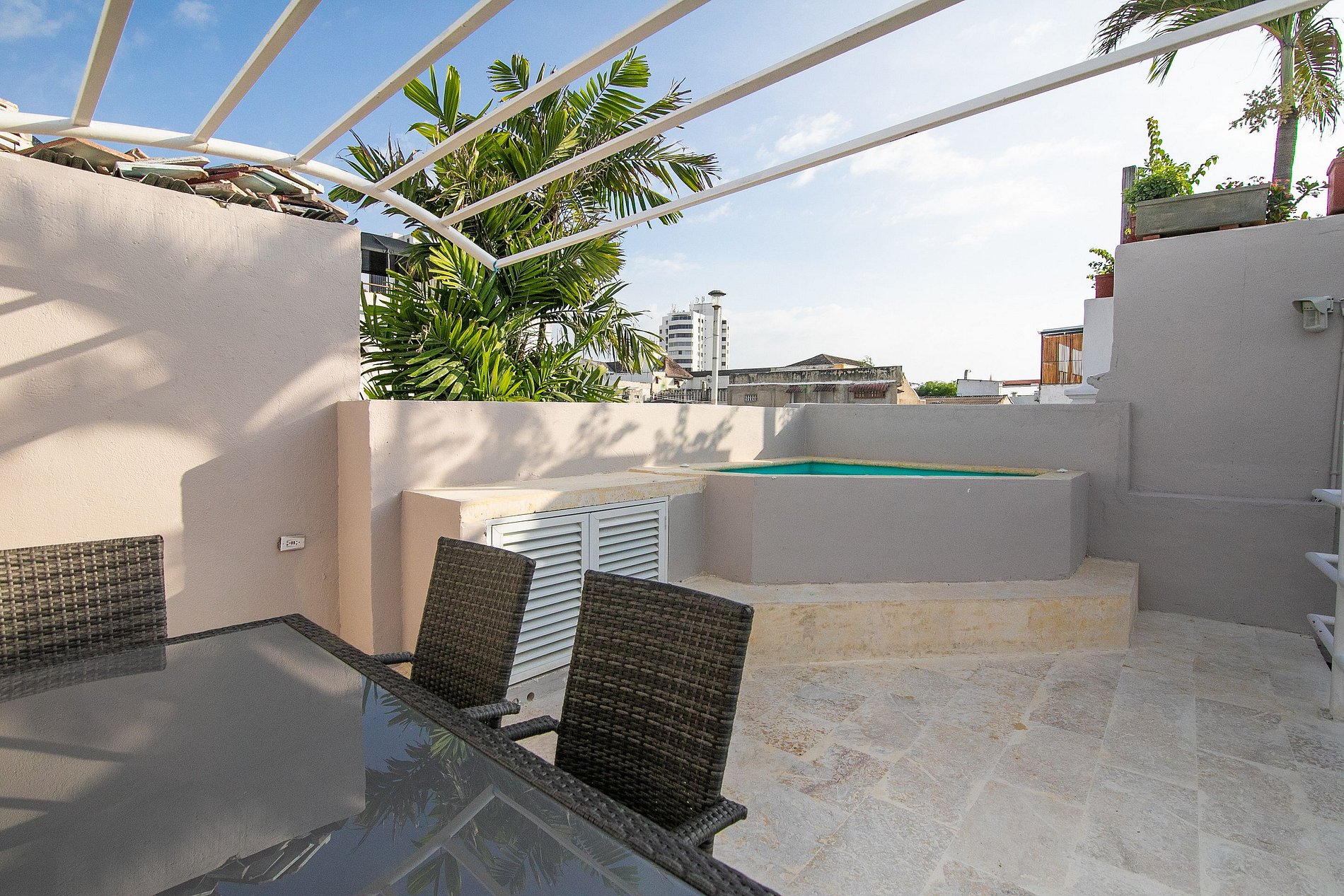 Casa de cuatro habitaciones en el Centro Histórico de Cartagena. Si estás pensando en visitar la Heroica, esta casa es el lugar ideal para hospedarte con tus amigos o familiares. Te sentirás en la comodidad de tu casa. Todos los espacios están diseñados para brindarte seguridad, tranquilidad y descanso. La casa cuenta con piscina en el primer nivel y jacuzzi en la terraza. Sala espaciosa para reunirse o para trabajar y un gran comedor. Está ubicada muy cerca de la ciudad amurallada, de las tiendas y restaurantes más famosos.