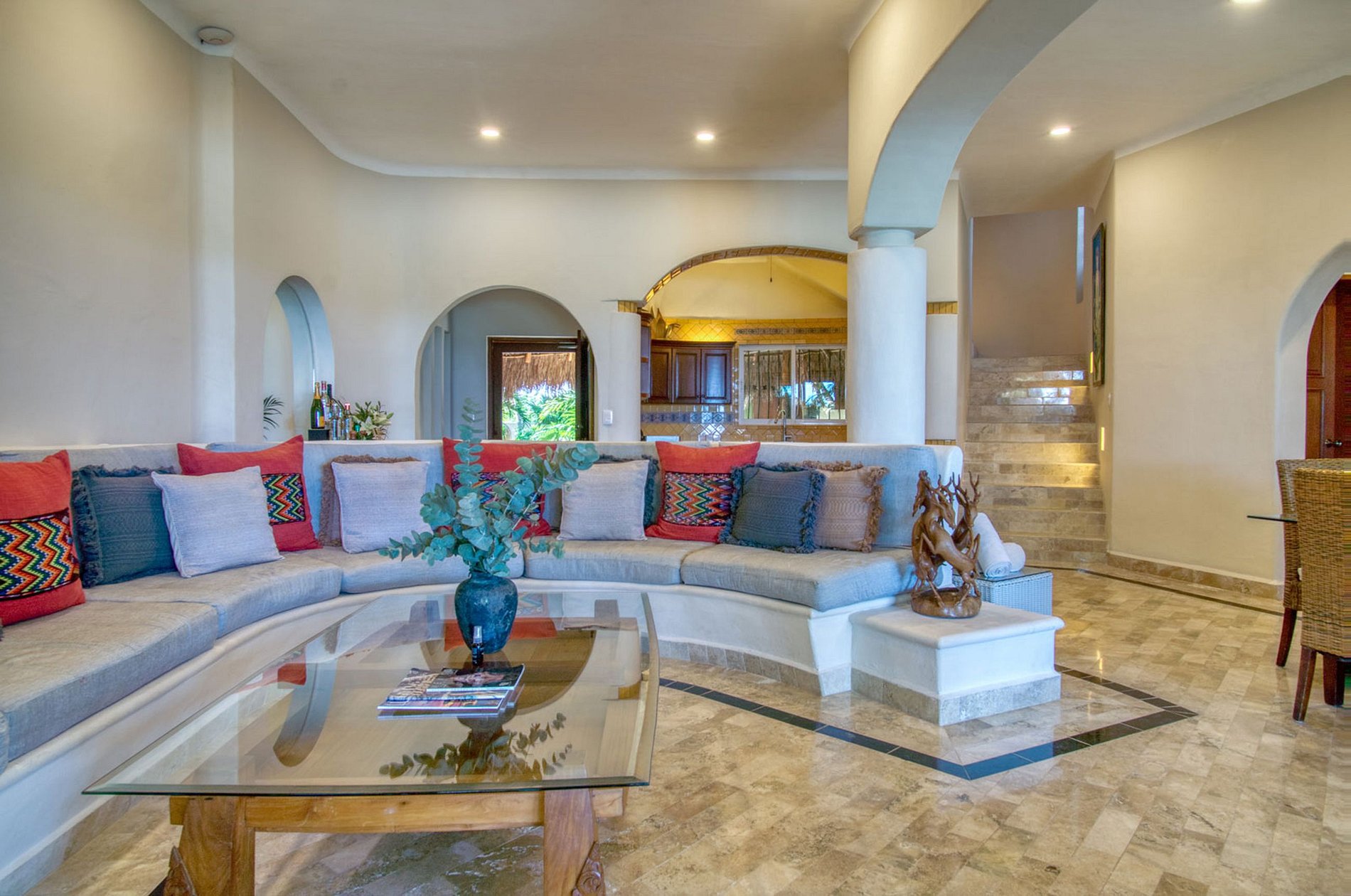 Las salas de estar iluminadas por el sol incluyen una elegante cocina equipada profesionalmente, un comedor formal y una acogedora sala de estar que es ideal para planificar sus próximas aventuras mientras continúa explorando las experiencias que solo Bahía tiene para ofrecer. Soliman puede ofrecer. La propiedad cuenta con un ambiente relajante y relajante creado por la lujosa decoración que aprovecha la tendencia de colores acogedores y contornos redondos. Las losas de vidrio completamente transparentes combinan el entorno exterior que lo rodea con el espectacular patio de la piscina frente al mar donde puede disfrutar de la gran variedad de tumbonas y una palapa cuidadosamente construida, una fuente constante de sombra para aquellos que prefieren el clima perfecto. sentir la refrescante brisa marina.