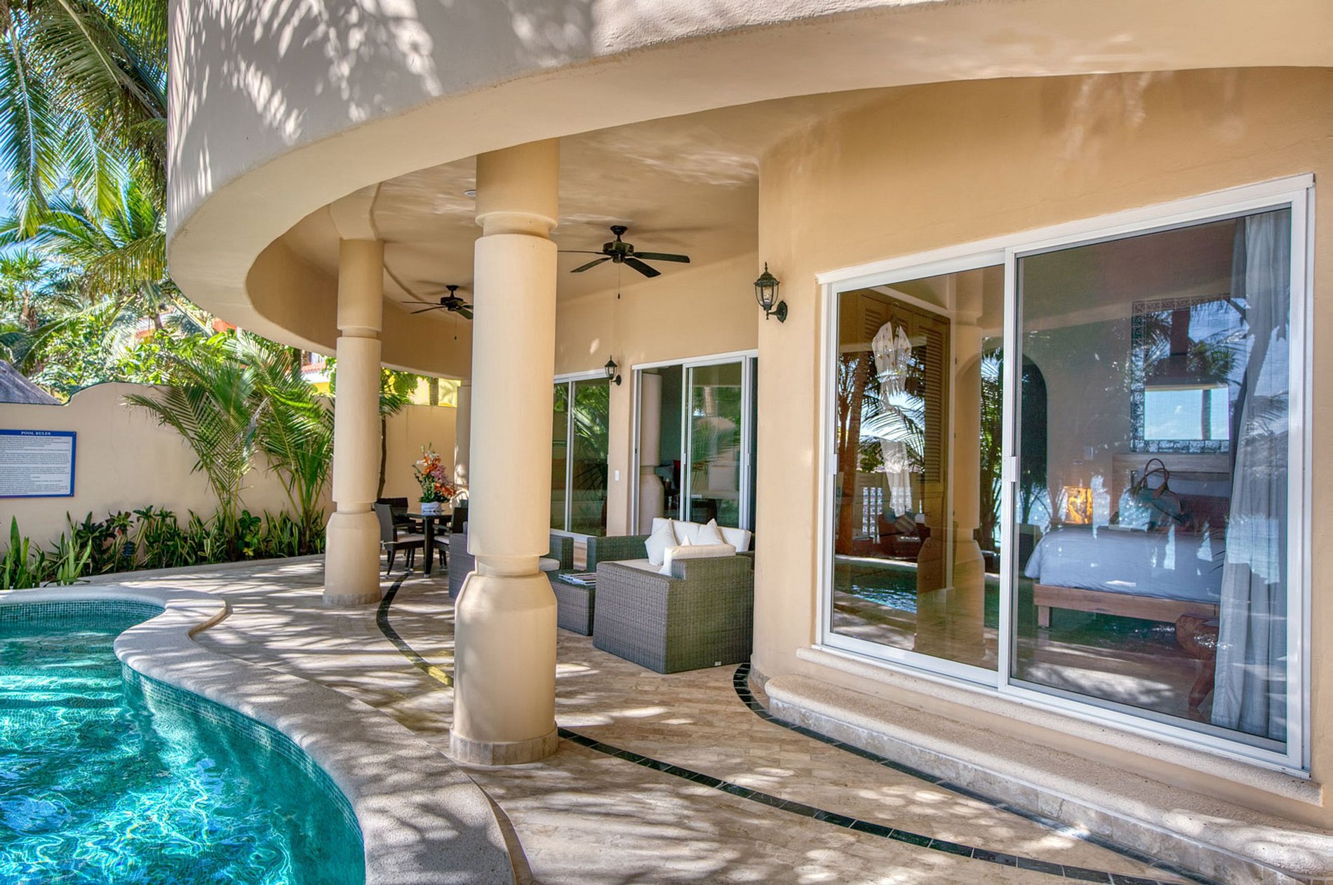 Las salas de estar iluminadas por el sol incluyen una elegante cocina equipada profesionalmente, un comedor formal y una acogedora sala de estar que es ideal para planificar sus próximas aventuras mientras continúa explorando las experiencias que solo Bahía tiene para ofrecer. Soliman puede ofrecer. La propiedad cuenta con un ambiente relajante y relajante creado por la lujosa decoración que aprovecha la tendencia de colores acogedores y contornos redondos. Las losas de vidrio completamente transparentes combinan el entorno exterior que lo rodea con el espectacular patio de la piscina frente al mar donde puede disfrutar de la gran variedad de tumbonas y una palapa cuidadosamente construida, una fuente constante de sombra para aquellos que prefieren el clima perfecto. sentir la refrescante brisa marina.