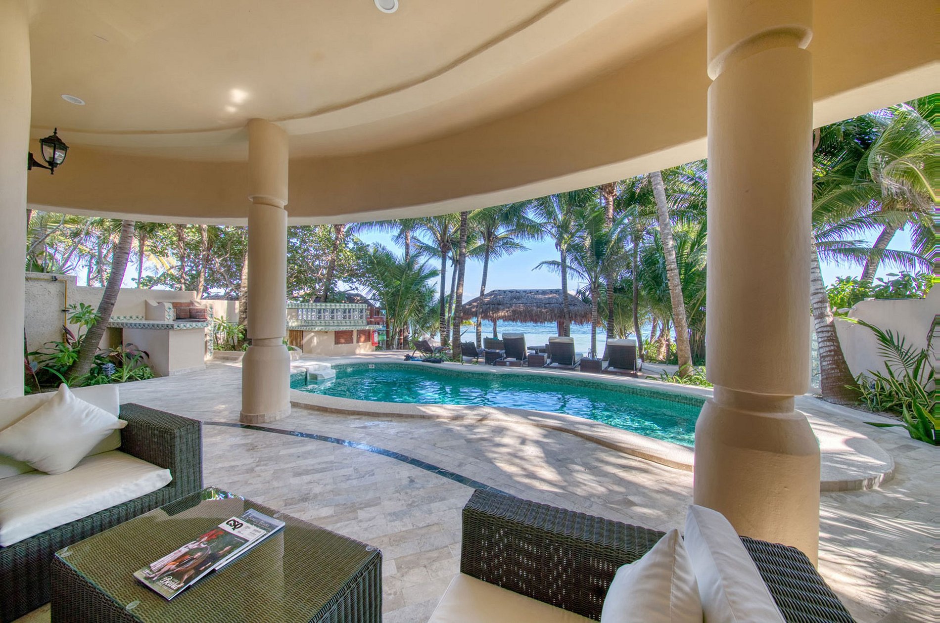 Las salas de estar iluminadas por el sol incluyen una elegante cocina equipada profesionalmente, un comedor formal y una acogedora sala de estar que es ideal para planificar sus próximas aventuras mientras continúa explorando las experiencias que solo Bahía tiene para ofrecer. Soliman puede ofrecer. La propiedad cuenta con un ambiente relajante y relajante creado por la lujosa decoración que aprovecha la tendencia de colores acogedores y contornos redondos. Las losas de vidrio completamente transparentes combinan el entorno exterior que lo rodea con el espectacular patio de la piscina frente al mar donde puede disfrutar de la gran variedad de tumbonas y una palapa cuidadosamente construida, una fuente constante de sombra para aquellos que prefieren el clima perfecto. sentir la refrescante brisa marina.
