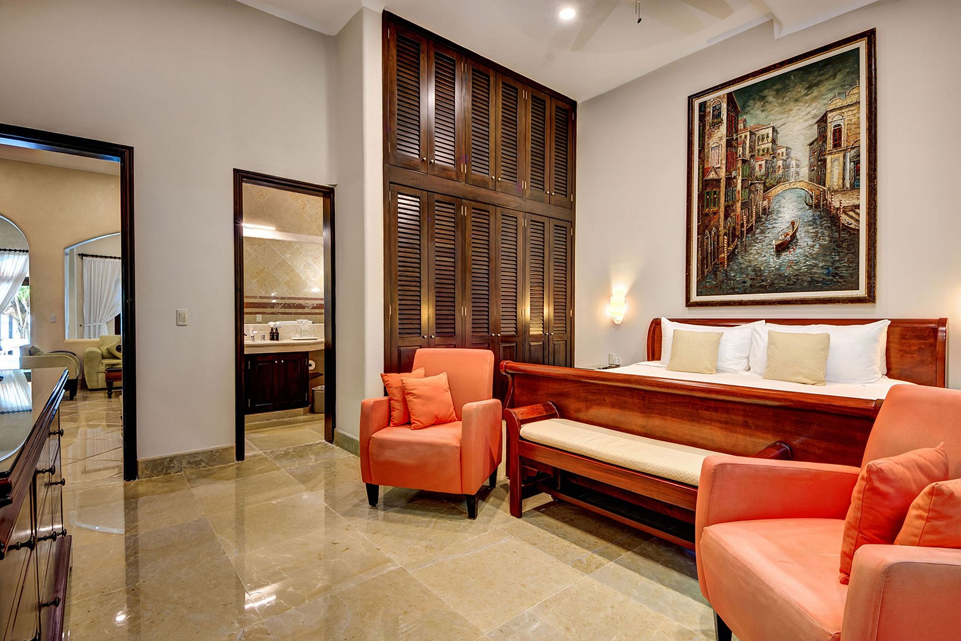 Cama king size, aire acondicionado, ventilador de techo, baño privado con bañera y ducha, secador de pelo, vista al mar, caja de seguridad, TV, pantalla de ventana
