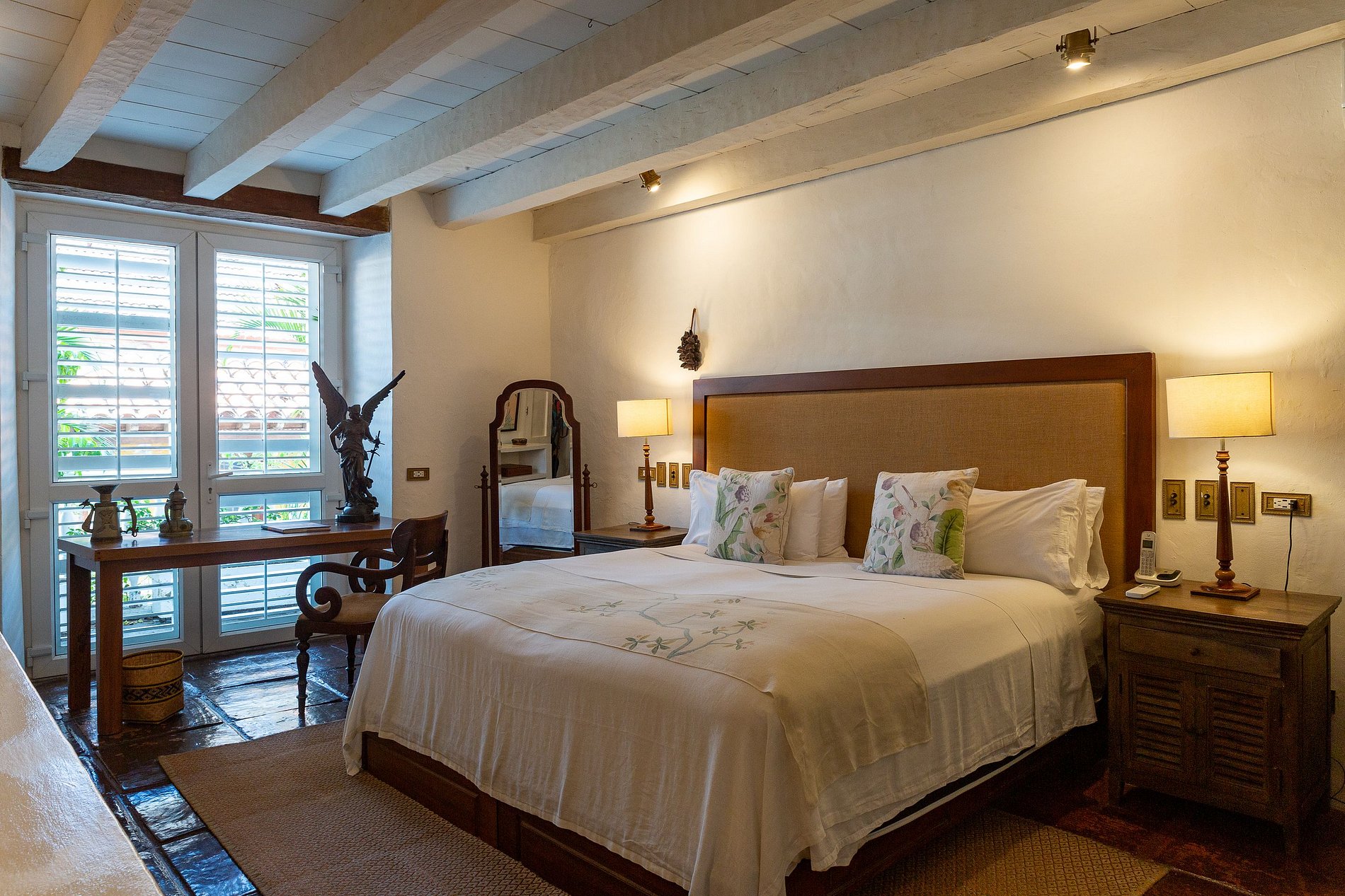 - Segundo Piso: Habitaciones Lujosas El segundo piso alberga seis amplias y únicas habitaciones decoradas con estilo, incluyendo una suite dúplex que puede acomodar hasta cuatro huéspedes. Cada habitación está diseñada pensando en el estilo y la comodidad, ofreciendo ropa de cama de algodón de lujo, toppers de colchón de plumas, aire acondicionado, TV satelital de 43', caja fuerte, artículos de tocador de lujo, batas de seda y secador de pelo. Algunas habitaciones cuentan con balcones con vistas encantadoras a las coloridas calles de Cartagena o al sereno jardín interno. El desayuno está incluido.