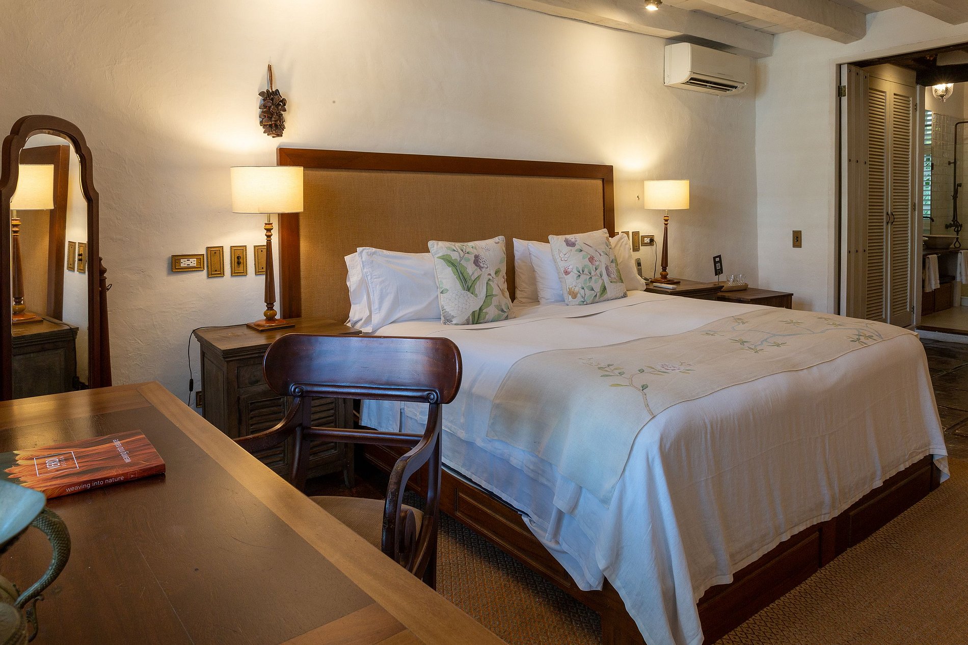 - Segundo Piso: Habitaciones Lujosas El segundo piso alberga seis amplias y únicas habitaciones decoradas con estilo, incluyendo una suite dúplex que puede acomodar hasta cuatro huéspedes. Cada habitación está diseñada pensando en el estilo y la comodidad, ofreciendo ropa de cama de algodón de lujo, toppers de colchón de plumas, aire acondicionado, TV satelital de 43', caja fuerte, artículos de tocador de lujo, batas de seda y secador de pelo. Algunas habitaciones cuentan con balcones con vistas encantadoras a las coloridas calles de Cartagena o al sereno jardín interno. El desayuno está incluido.