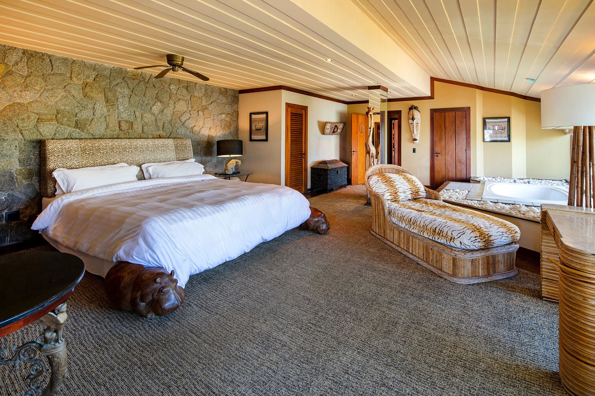 La casa cuenta con 5 suites increíbles que pueden acomodar a 14 personas con gran comodidad. Cada suite cuenta con un diseño y una decoración relajantes y agradables, y la Master Suite tiene un jacuzzi en la habitación. Las camas tienen colchones suaves y ropa de cama de alta calidad.