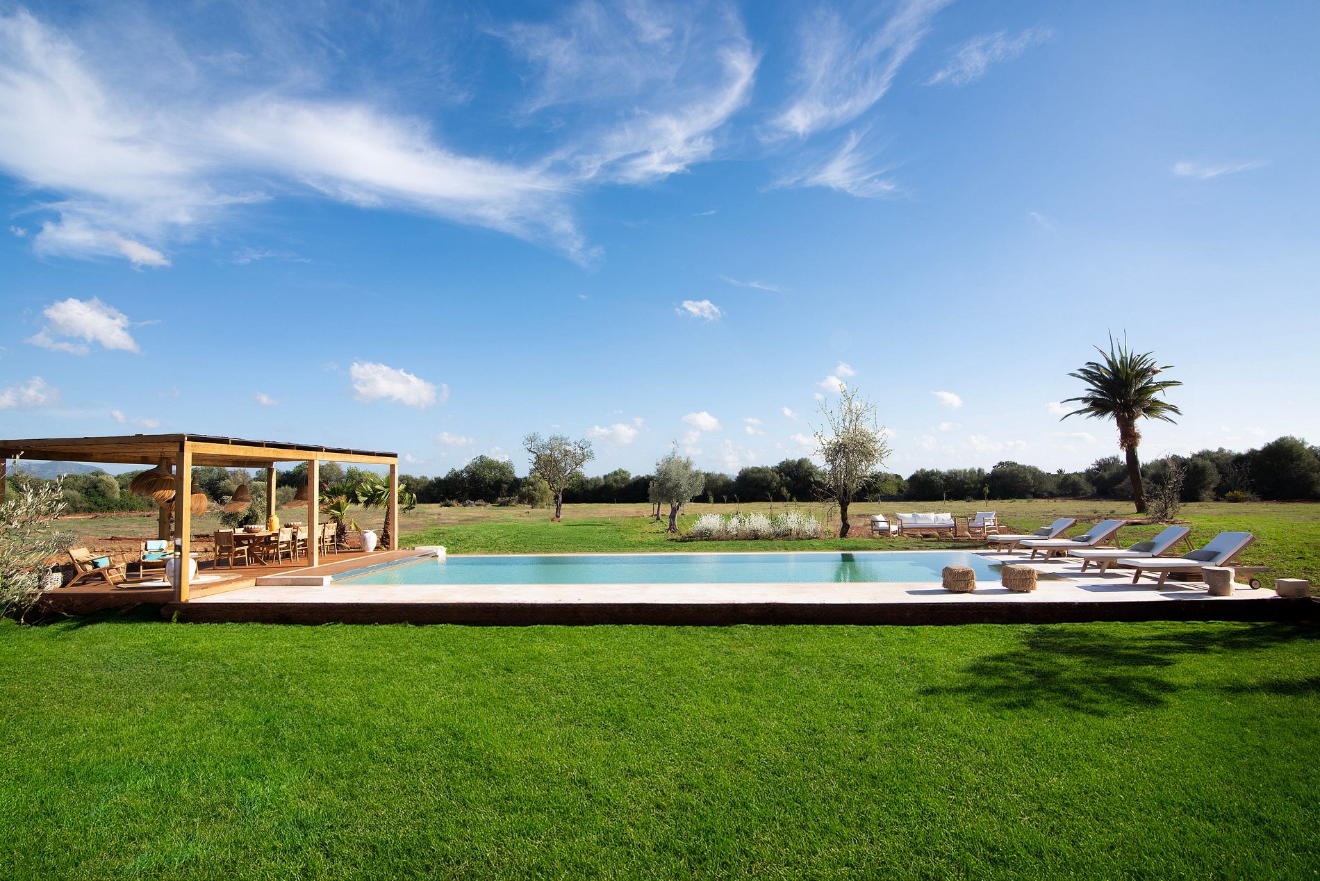 En el exterior, encontrarás amplias terrazas, patios, un jardín de cactus y olivos, una fuente con cascada, una chimenea para barbacoa, áreas de descanso y un tranquilo estanque de agua, creando una armonía entre el interior y el exterior con la naturaleza y la privacidad.