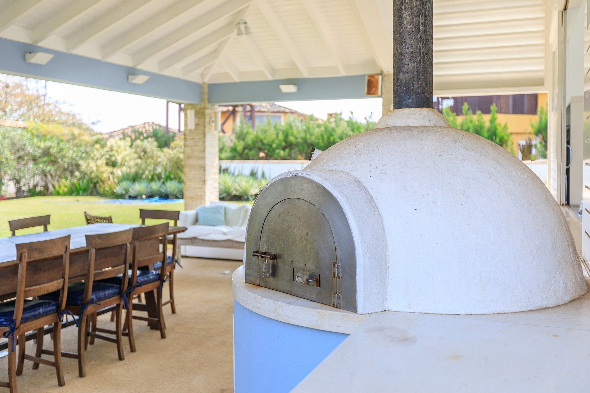 La galería se conecta con el jardín y cuenta con una elegante parrilla de acero inoxidable y un horno a leña perfecto para preparar pizzas y compartir momentos especiales con amigos.