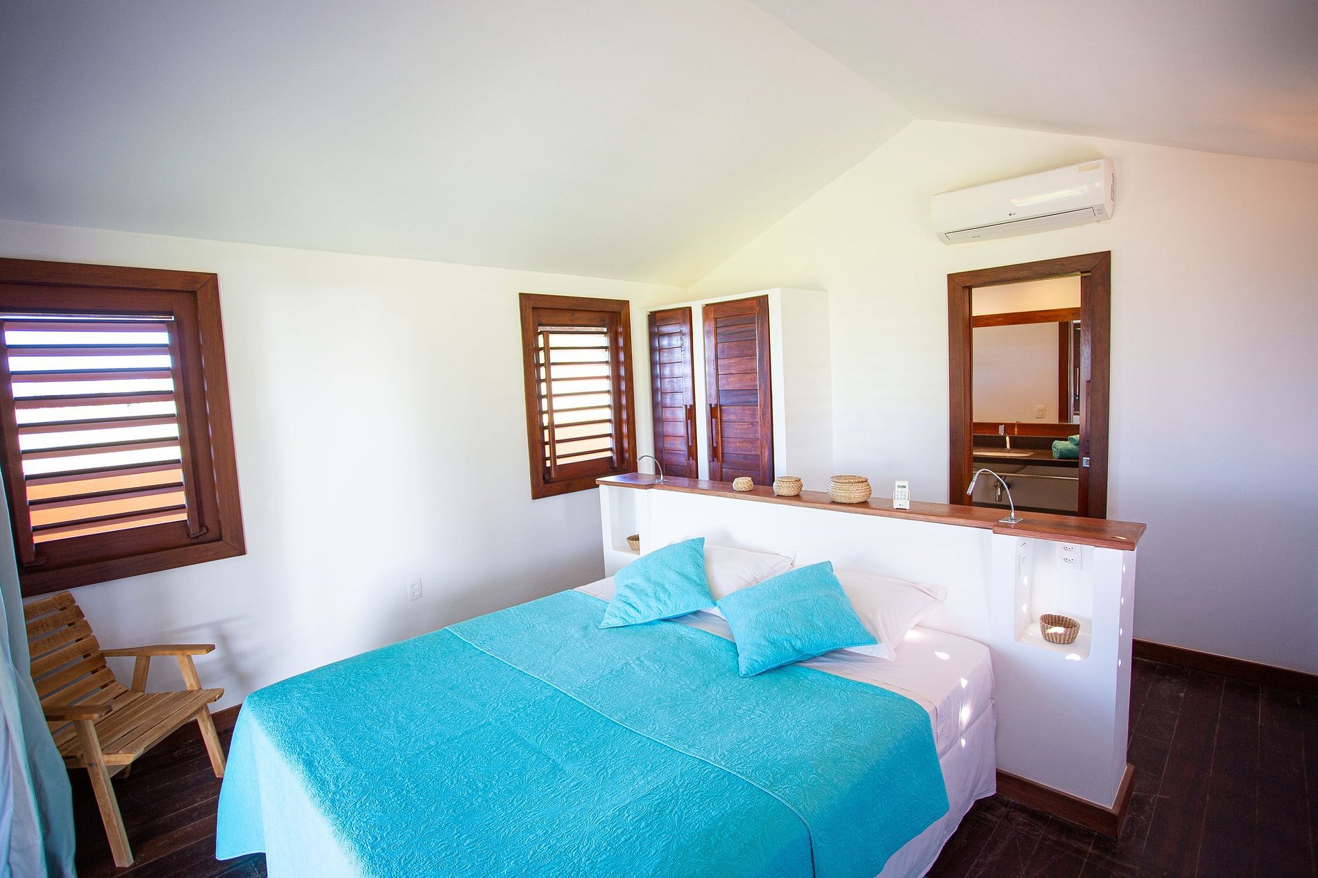 La casa cuenta con 6 hermosas suites con aire acondicionado, todas con camas dobles, 4 de ellas en la planta baja y 2 en el primer piso con un balcón que brinda una amplia vista de los alrededores.