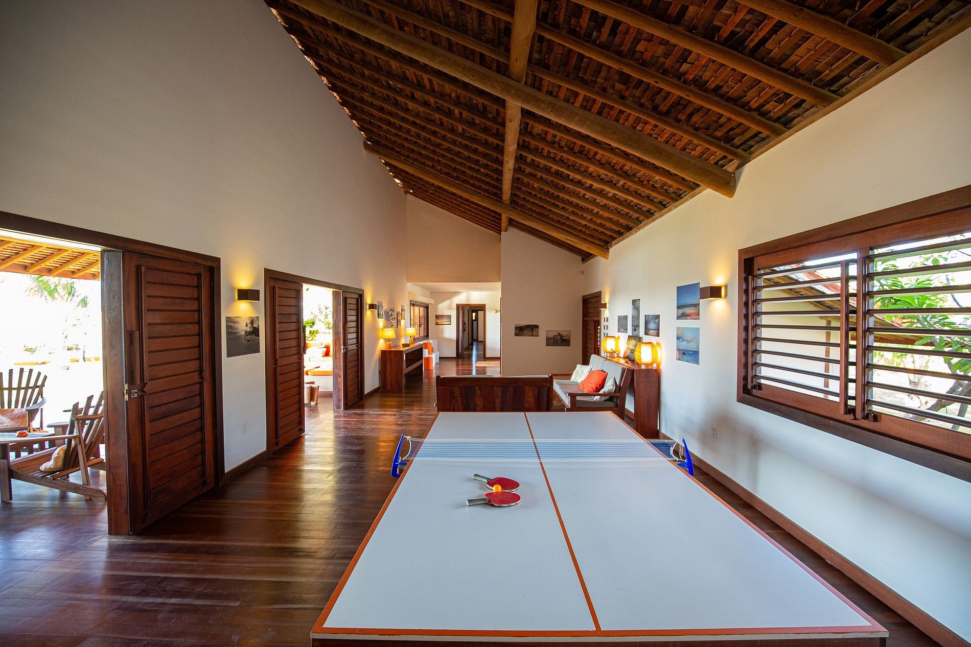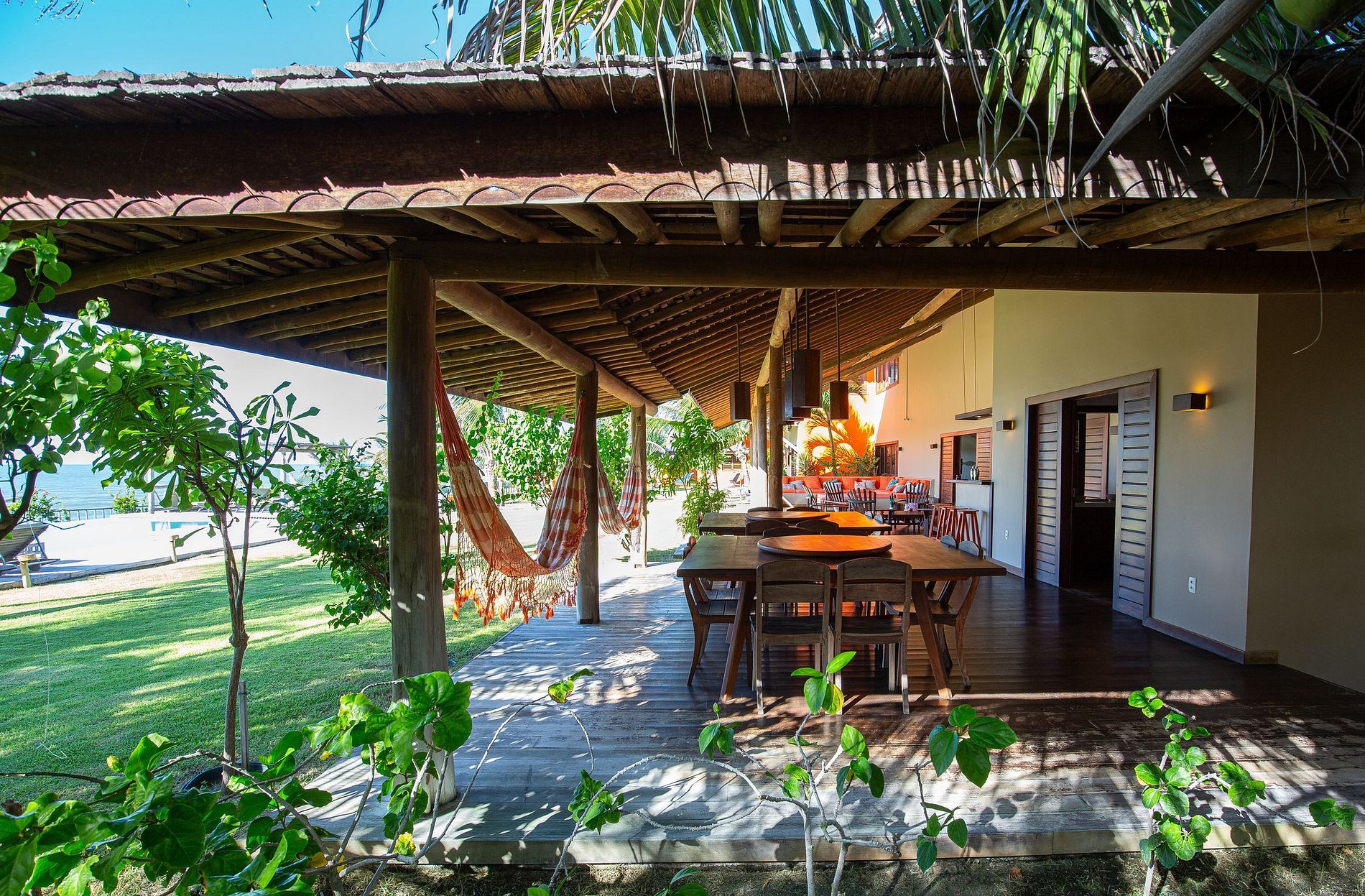La casa tiene 600m² de área construida, comenzando con la hermosa sala de estar amueblada con todos los muebles de madera y decorada con artesanías locales. La habitación tiene acceso al salón exterior de la casa que cuenta con varias hamacas para el descanso y un hermoso jardín con una gran piscina con cómodas tumbonas.