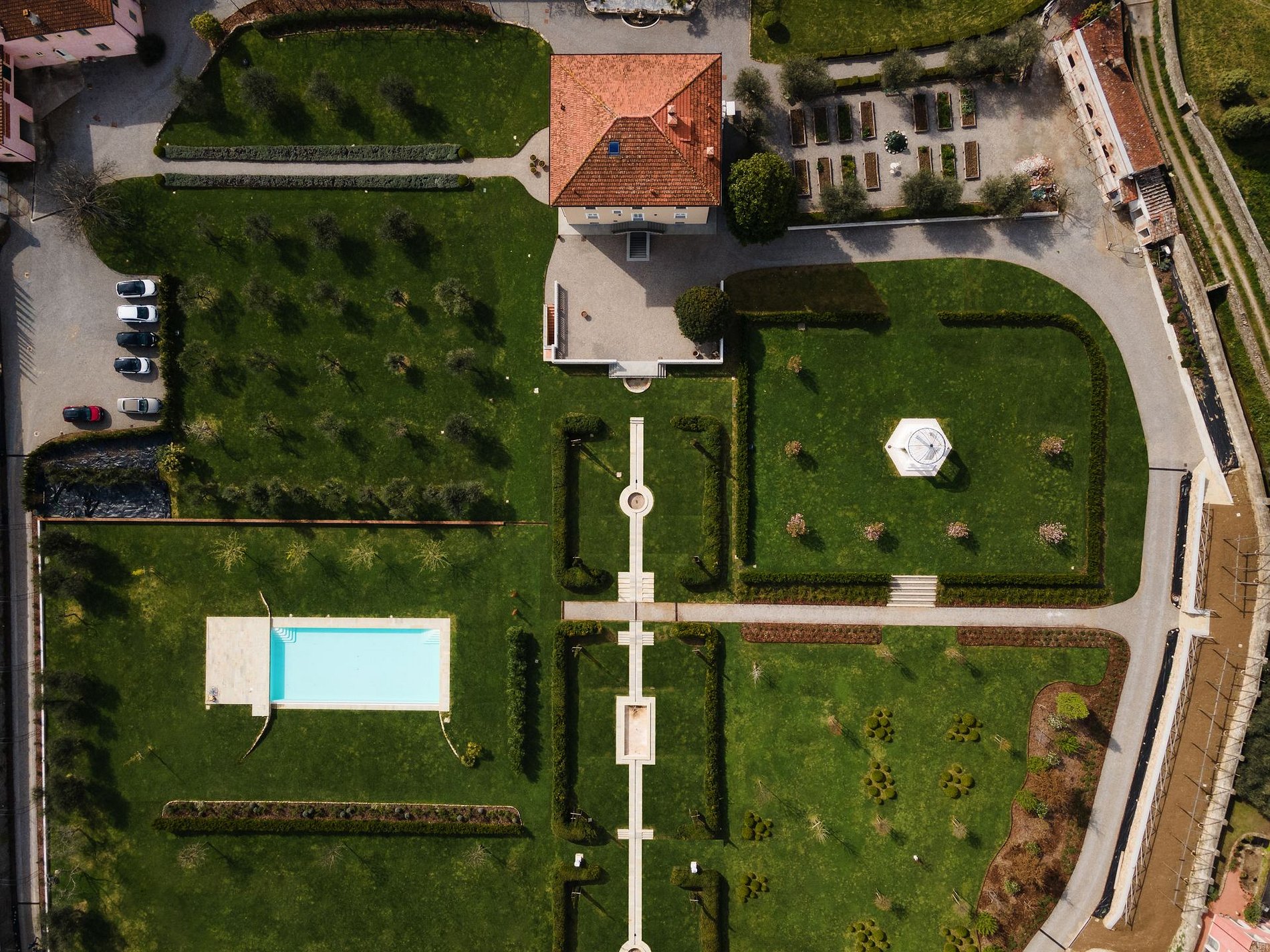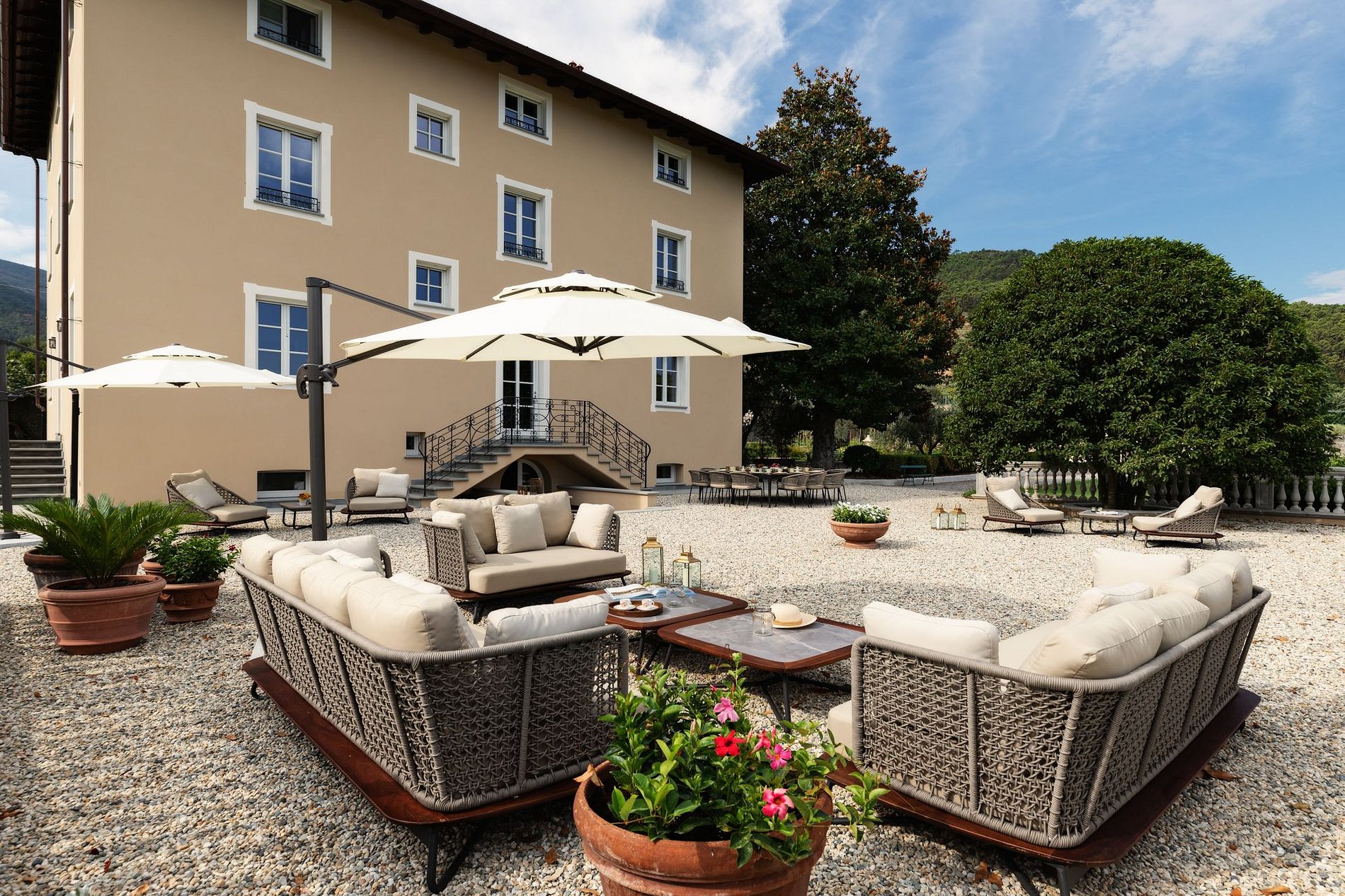 La villa cuenta con excelentes comodidades, como dos hectáreas de terreno con una piscina, un lago privado y varias áreas de estar al aire libre, incluyendo jardines temáticos como el Jardín de Arte y el Jardín de Bodas. Además, la propiedad cultiva sus propios productos, como verduras orgánicas, olivos para aceite de oliva extra virgen, una pérgola de kiwi y un limonero.