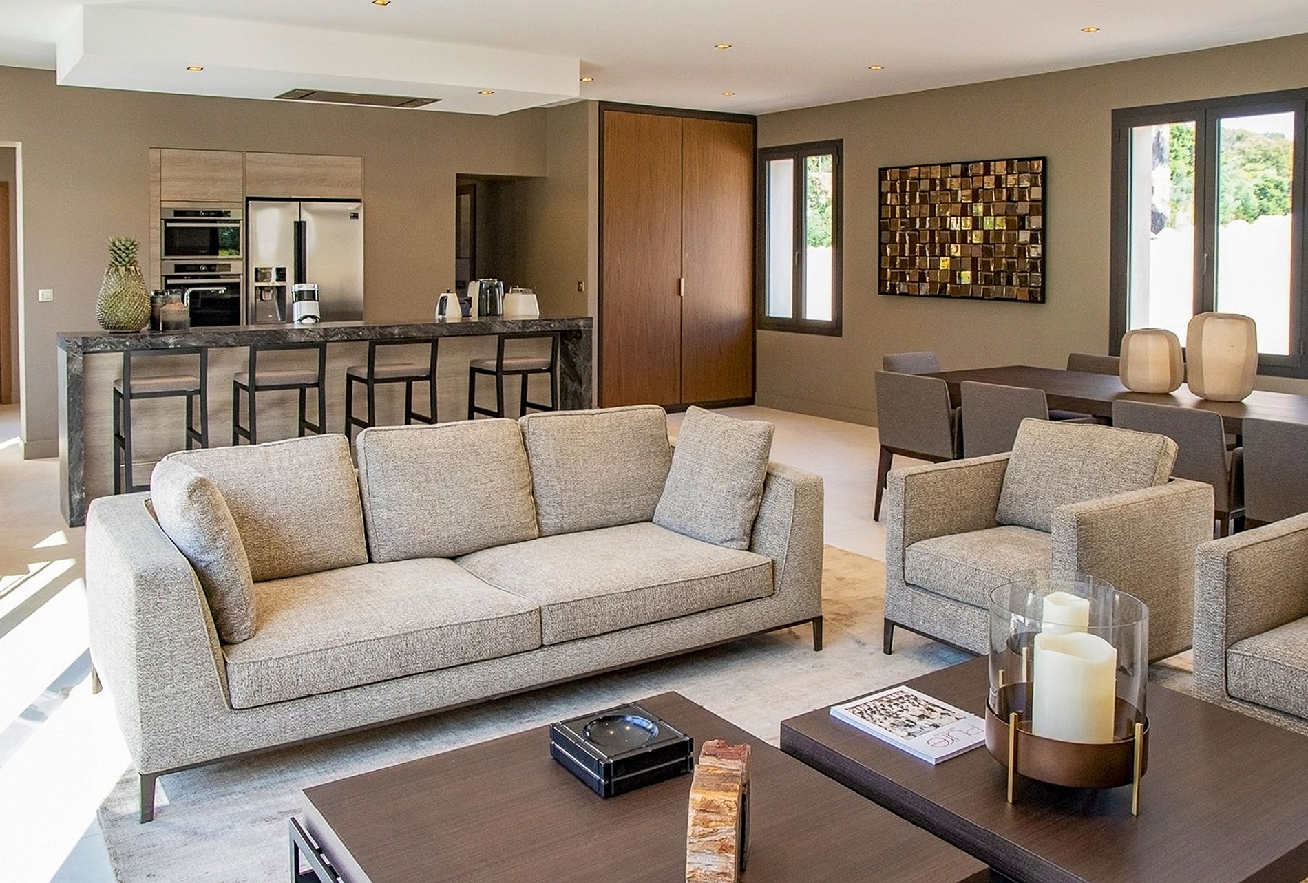 Esta villa cuenta con 320m2 de espacio interior, dos residencias con una piscina climatizada rodeada de romero y un parque con callejones de palmeras y olivos que ofrecen una estancia tranquila y perfecta, con total discreción.