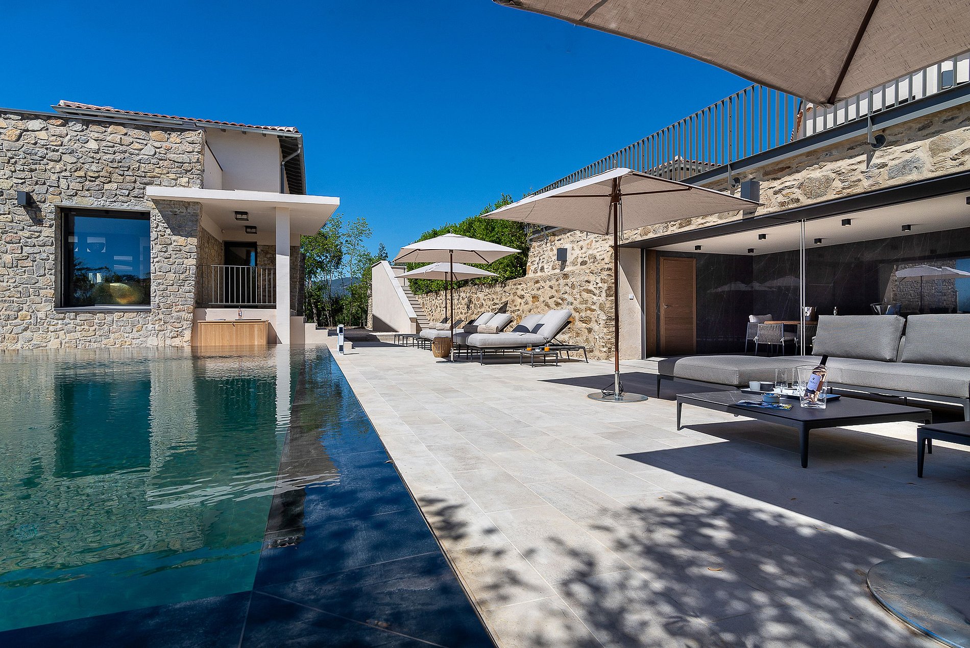 La villa de 390 m2 de espacio interior consta de una residencia principal y dos dependencias, una piscina infinita climatizada con una casa de la piscina y un jacuzzi en la terraza. Disfrutará especialmente de una vista panorámica al Mediterráneo y de las islas doradas, así como de una amplia terraza de verano totalmente equipada.