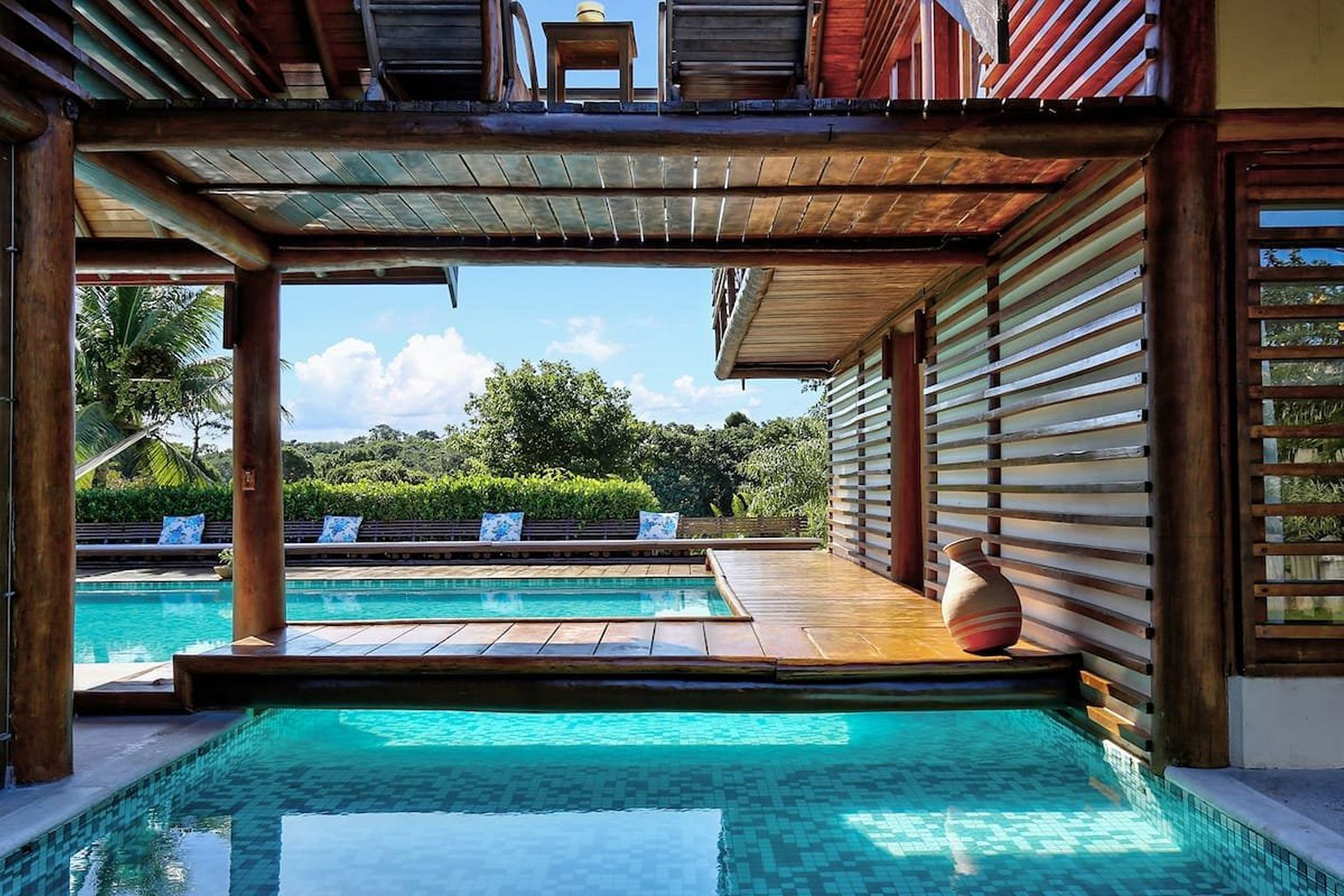 La inmensa piscina, las hamacas bajo una terraza tropical y las grandes palmeras que emergen de la vegetación exótica del jardín te harán olvidar todo el estrés y las preocupaciones de la vida cotidiana de inmediato. Todas las habitaciones de la villa son muy abiertas y amplificadas.