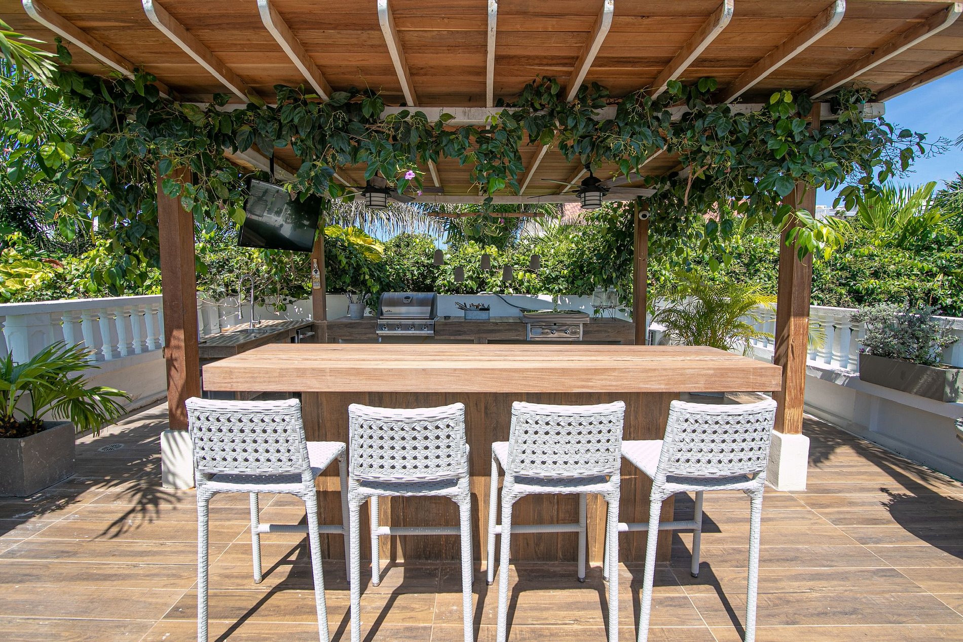 Esta casa de acabados modernos y mobiliario de lujo, cuenta con dos grandes piscinas. Una en el primer piso rodeada de palmeras creando un ambiente tropical y otra en la rooftop junto a un area con asoleadoras, un gimnasio privado y un spa de masajes al aire libre. Aquí mismo encontrará un área de barbacoa, 3 salas de estar distribuidas a lo largo de la casa, una sala de juegos y un home cinema.