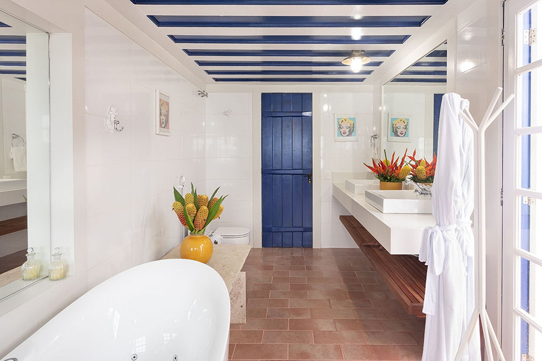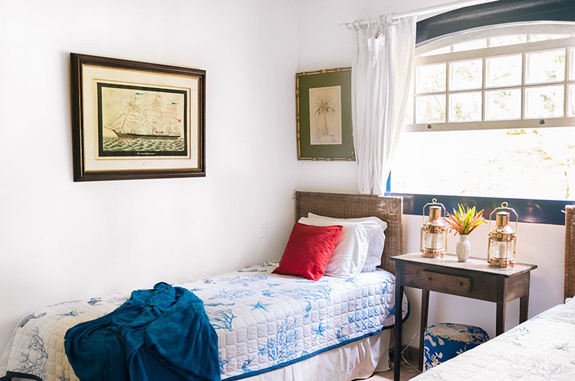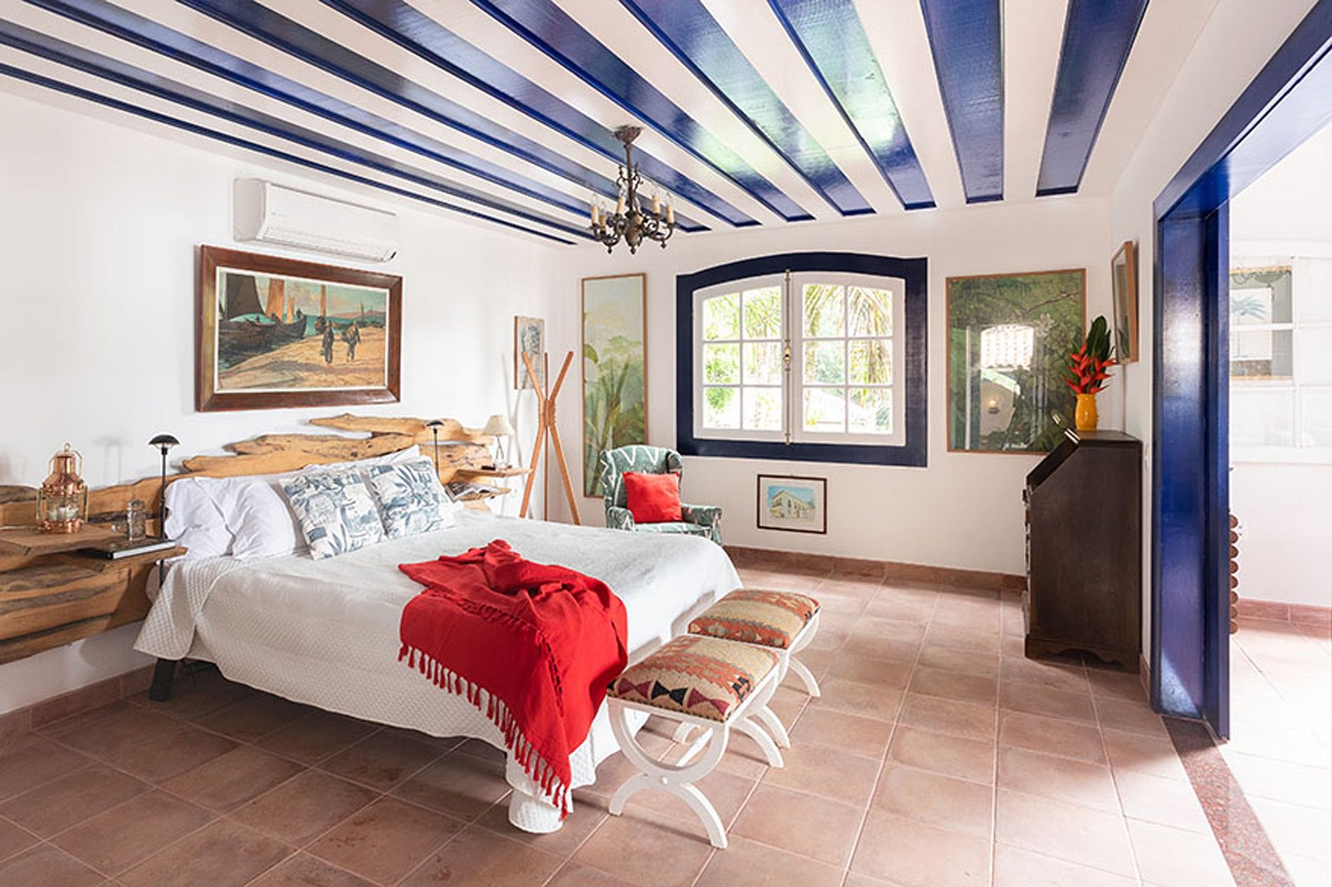 La casa de estilo colonial fue completamente renovada en 2020, con un proyecto firmado por el renombrado arquitecto Marcos Tomanik. Con siete espaciosas suites, tres de ellas con vistas al mar, todas con vestidor y amplios cuartos de baño, la propiedad ocupa una superficie de 1.500 m² y cuenta con hermosas cerámicas importadas de España. La decoración se compone de piezas recogidas por la familia en anticuarios náuticos, como brújulas de barco originales, escafandras e imitaciones de barcos de navegación ingleses, mezcladas con colores marinos y temas tropicales.