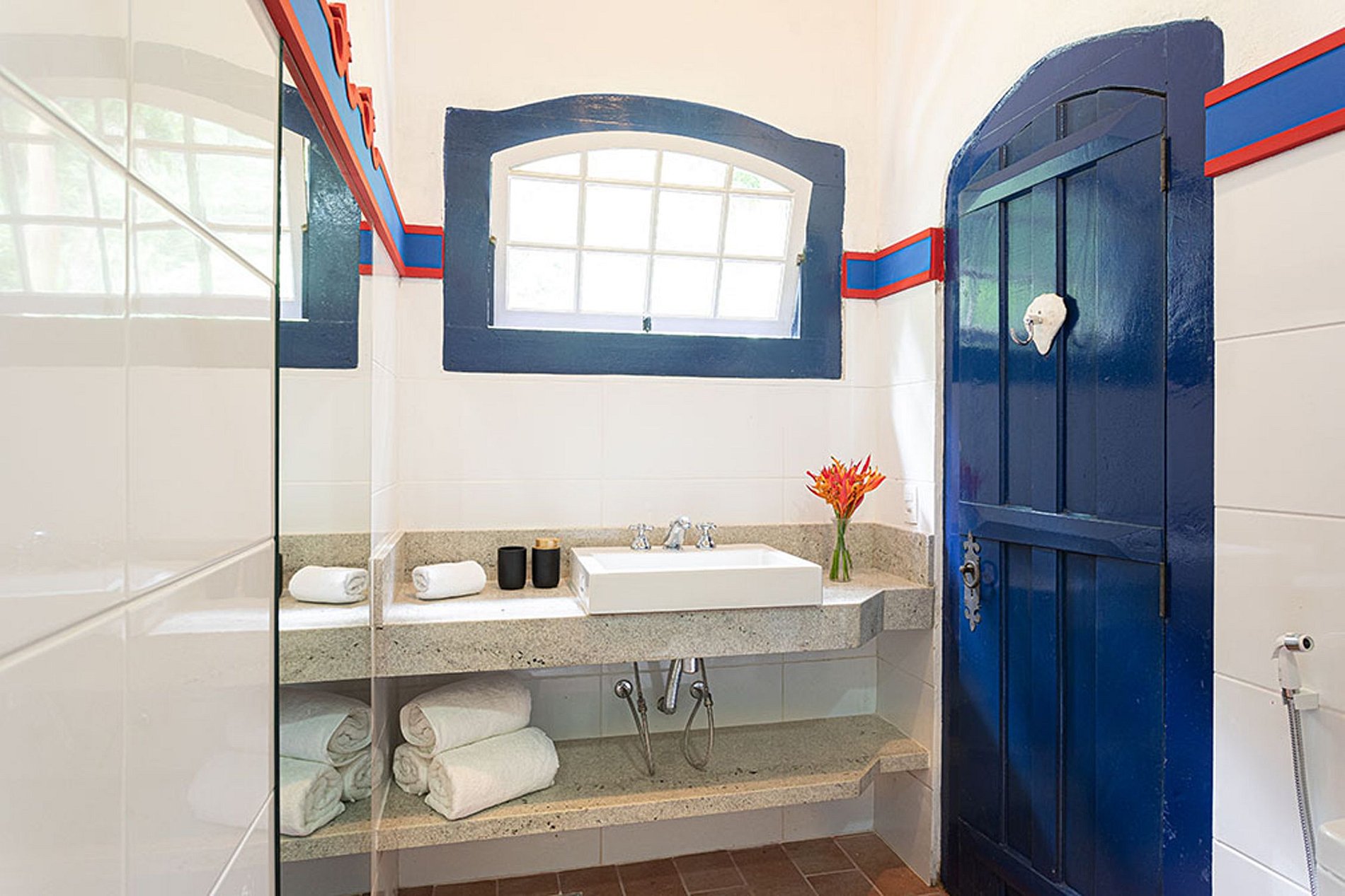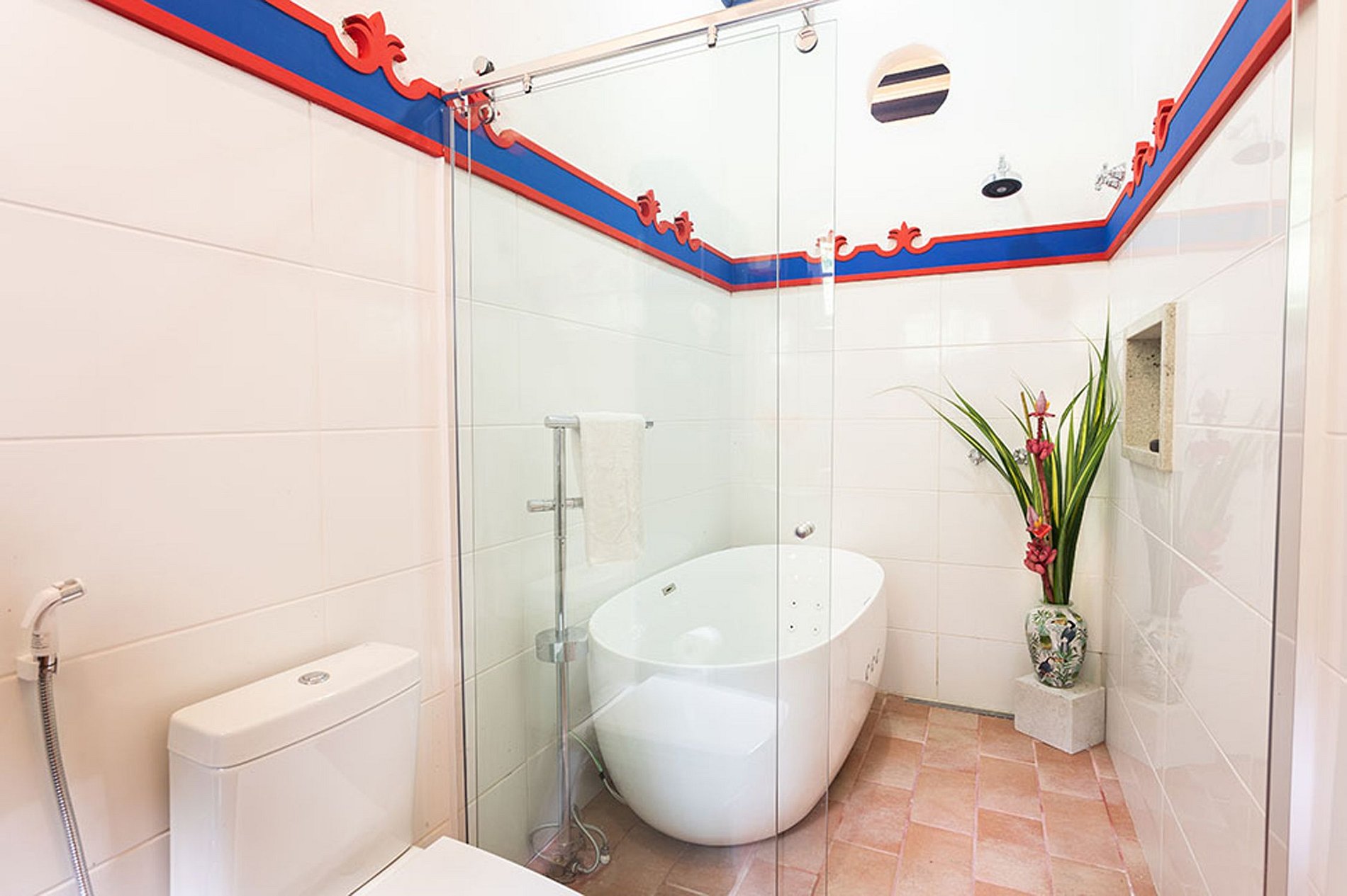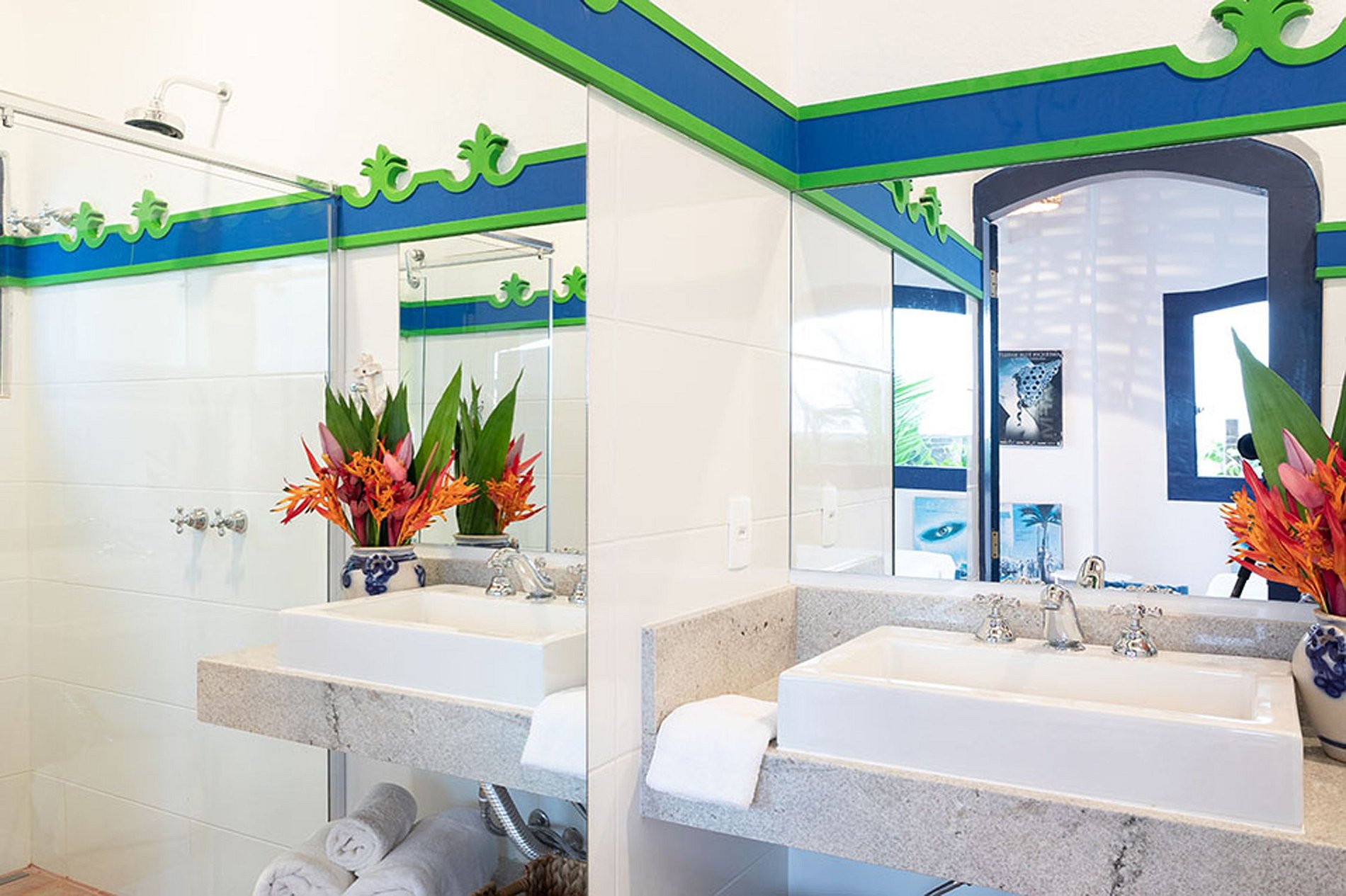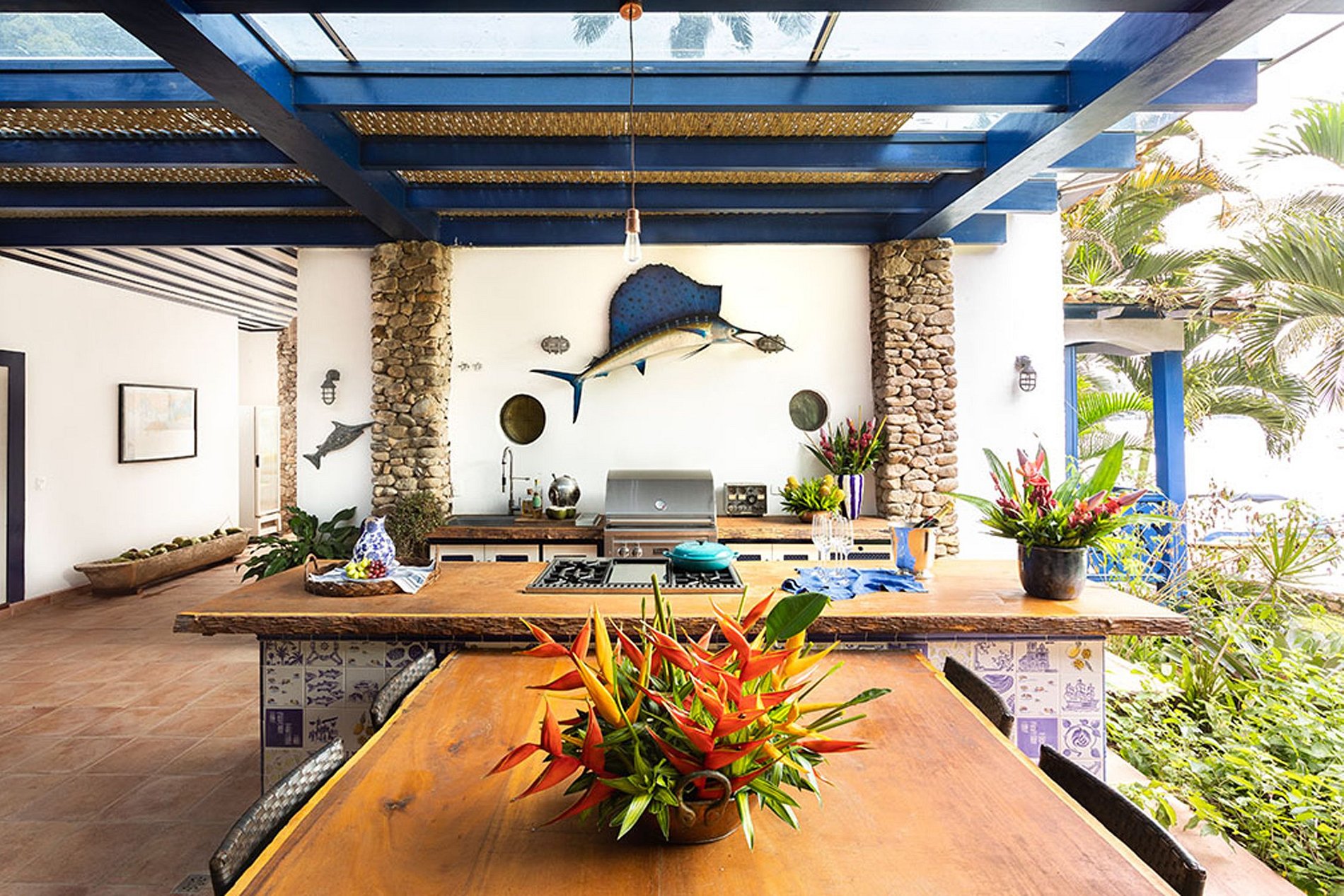 La casa de estilo colonial fue completamente renovada en 2020, con un proyecto firmado por el renombrado arquitecto Marcos Tomanik. Con siete espaciosas suites, tres de ellas con vistas al mar, todas con vestidor y amplios cuartos de baño, la propiedad ocupa una superficie de 1.500 m² y cuenta con hermosas cerámicas importadas de España. La decoración se compone de piezas recogidas por la familia en anticuarios náuticos, como brújulas de barco originales, escafandras e imitaciones de barcos de navegación ingleses, mezcladas con colores marinos y temas tropicales.