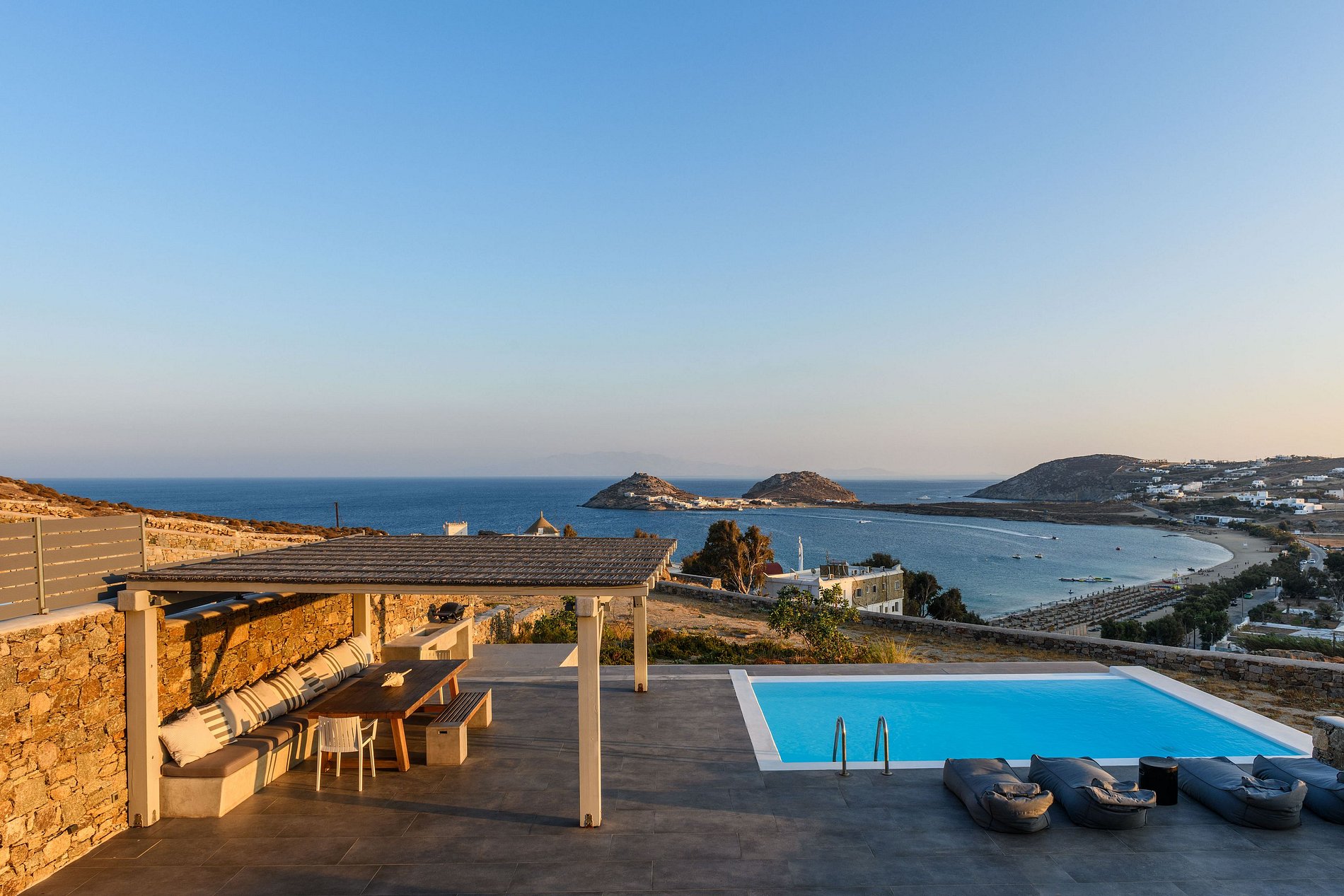 Los elementos de diseño meticulosamente seleccionados y los elementos de madera en toda la villa crean una atmósfera cálida y acogedora, mientras que los pisos superiores ofrecen impresionantes vistas al mar de la playa de Kalafatis y de la pintoresca isla de Divounia.