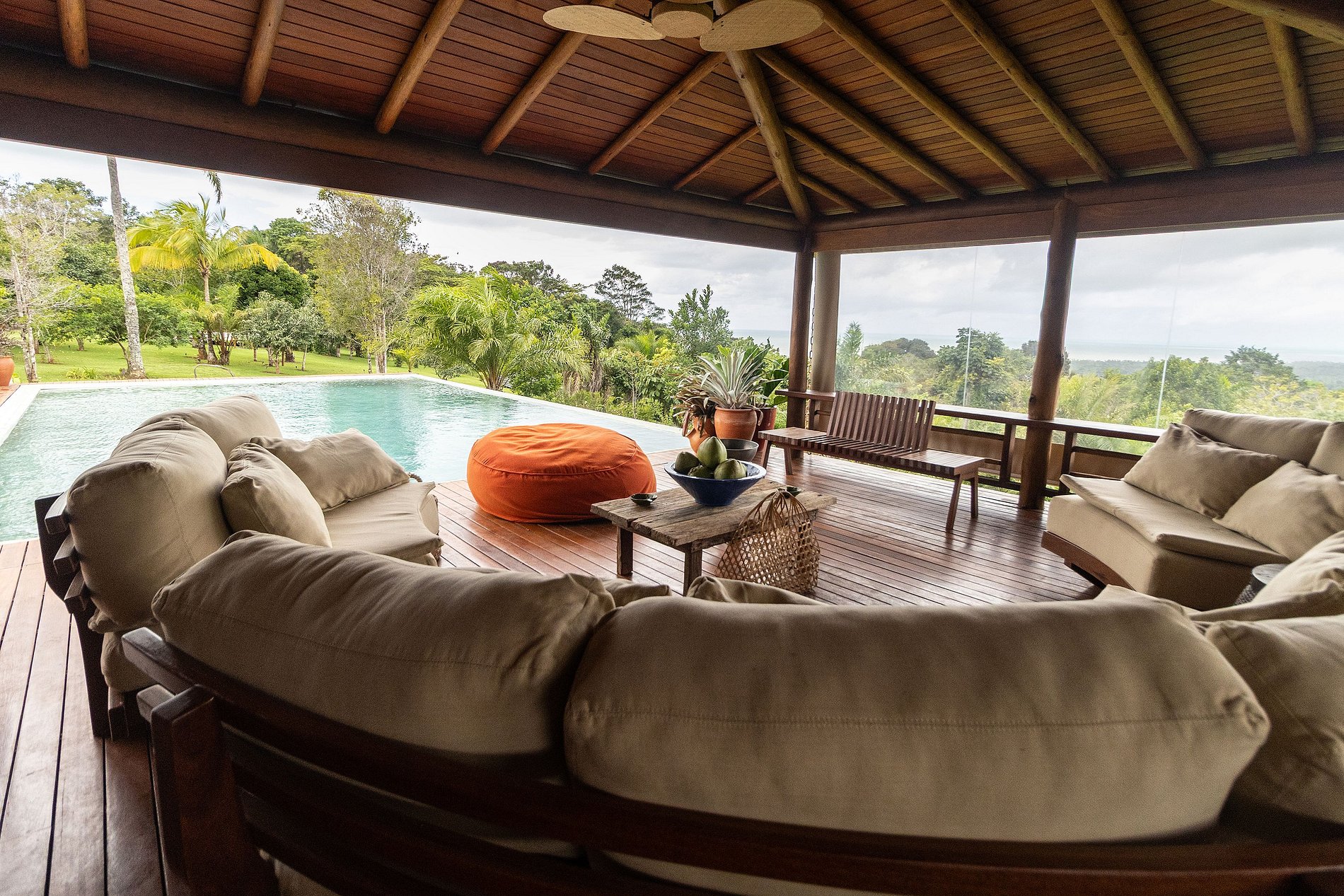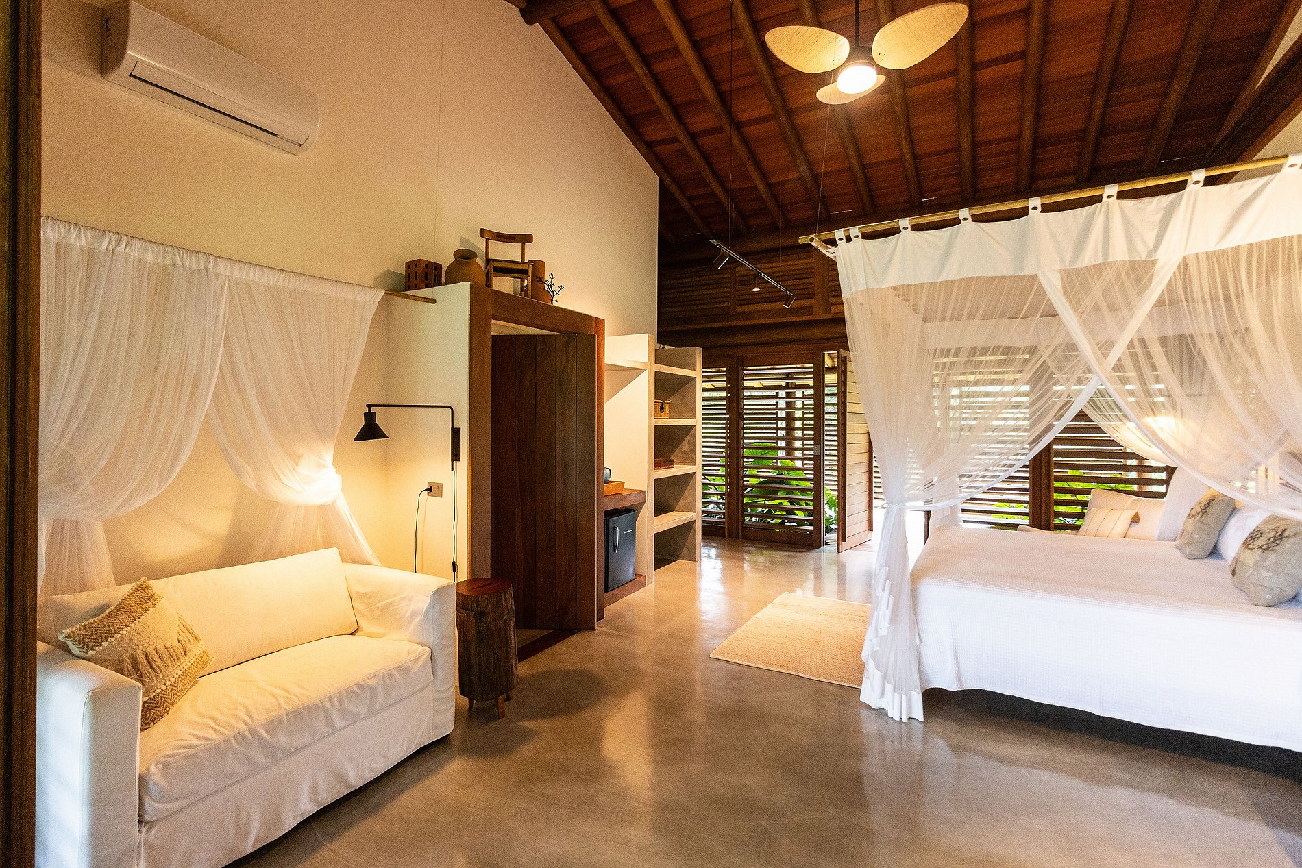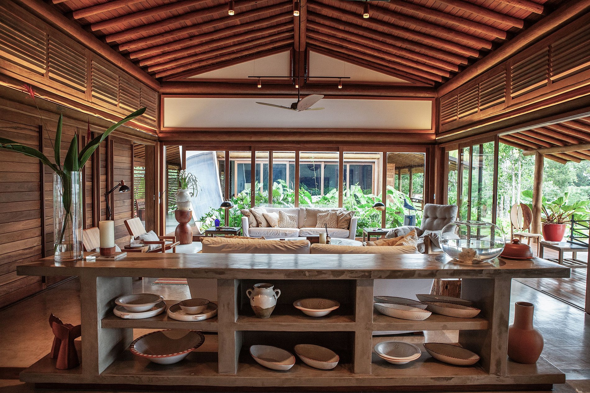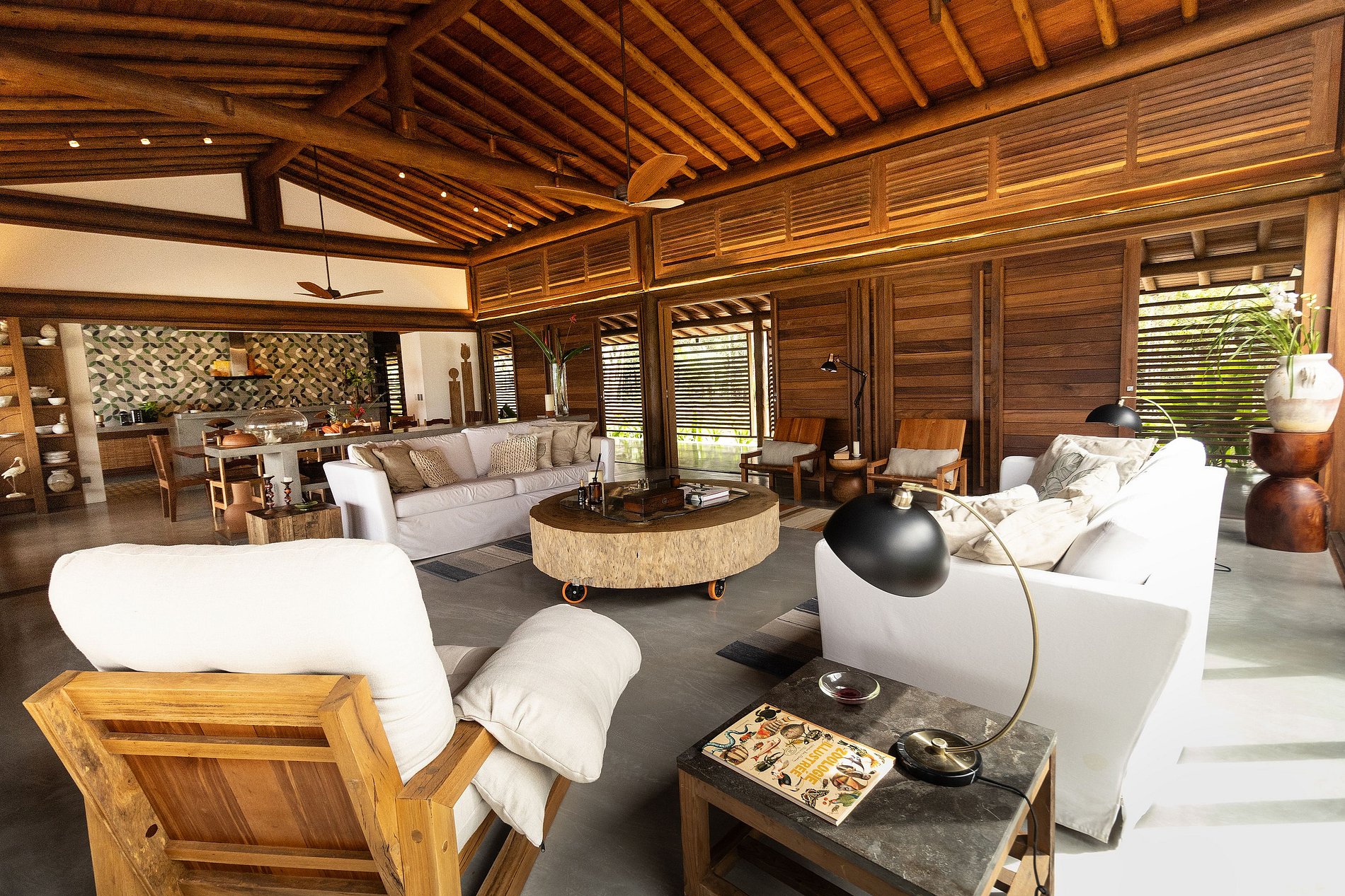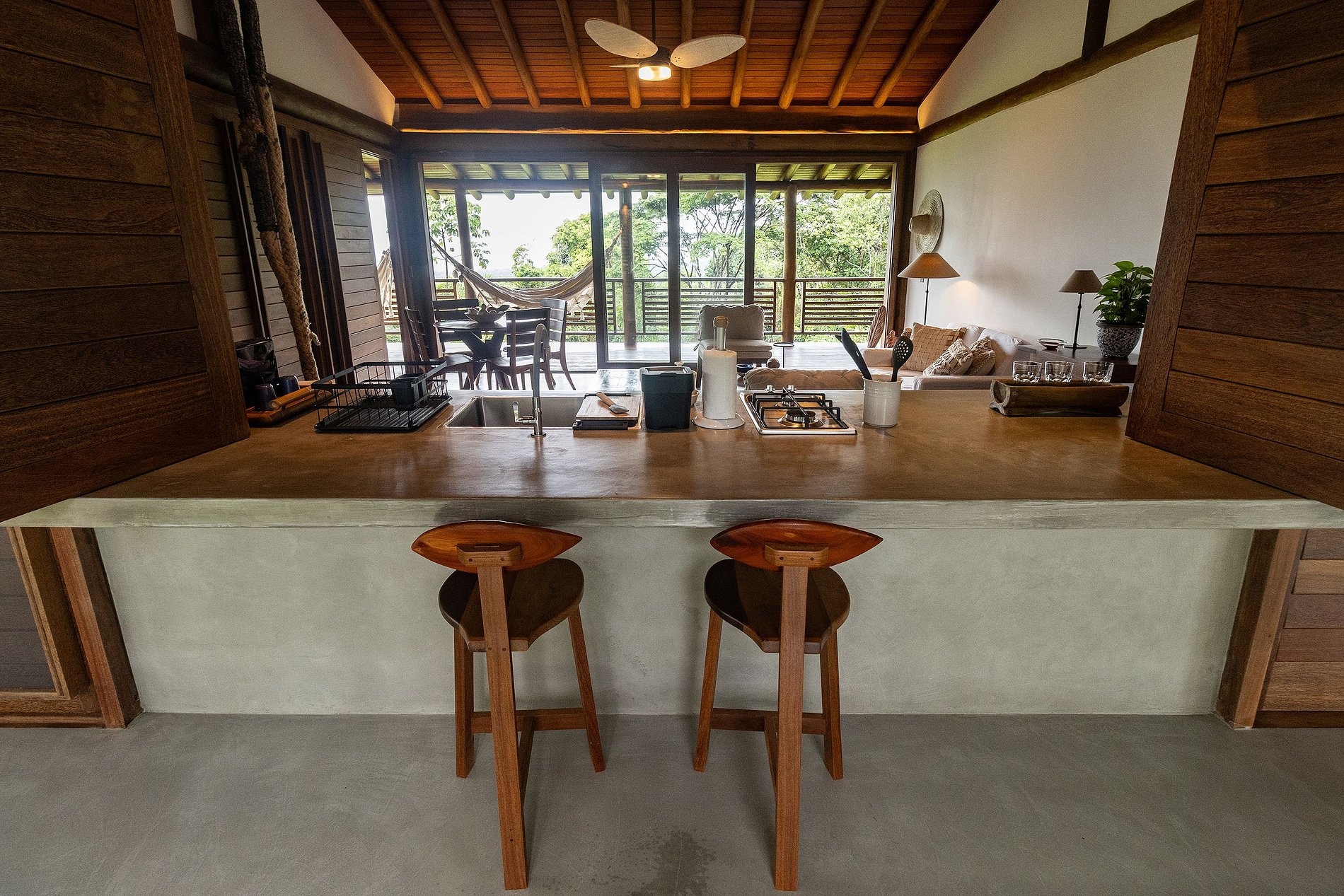 Alojamiento: La casa principal cuenta con tres amplias suites (camas super king). Una hermosa sala de estar con cómodos sofás y sillones invita a una conversación íntima. La sala de estar tiene vistas a la piscina, con su suelo de baldosas verdes que armoniza con los colores del entorno. Junto a ella se encuentra una cocina gourmet con una hermosa parrilla, horno de leña y una mesa de comedor para 16 personas. Los dos bungalows independientes, cada uno con dos dormitorios y un baño, cuentan con sala de estar y balcón con vistas al océano y a la Mata Atlántica. El pabellón multiusos es ideal para clases de yoga, eventos o actividades de ocio, equipado con mesa de ping pong, billar y futbolín.
