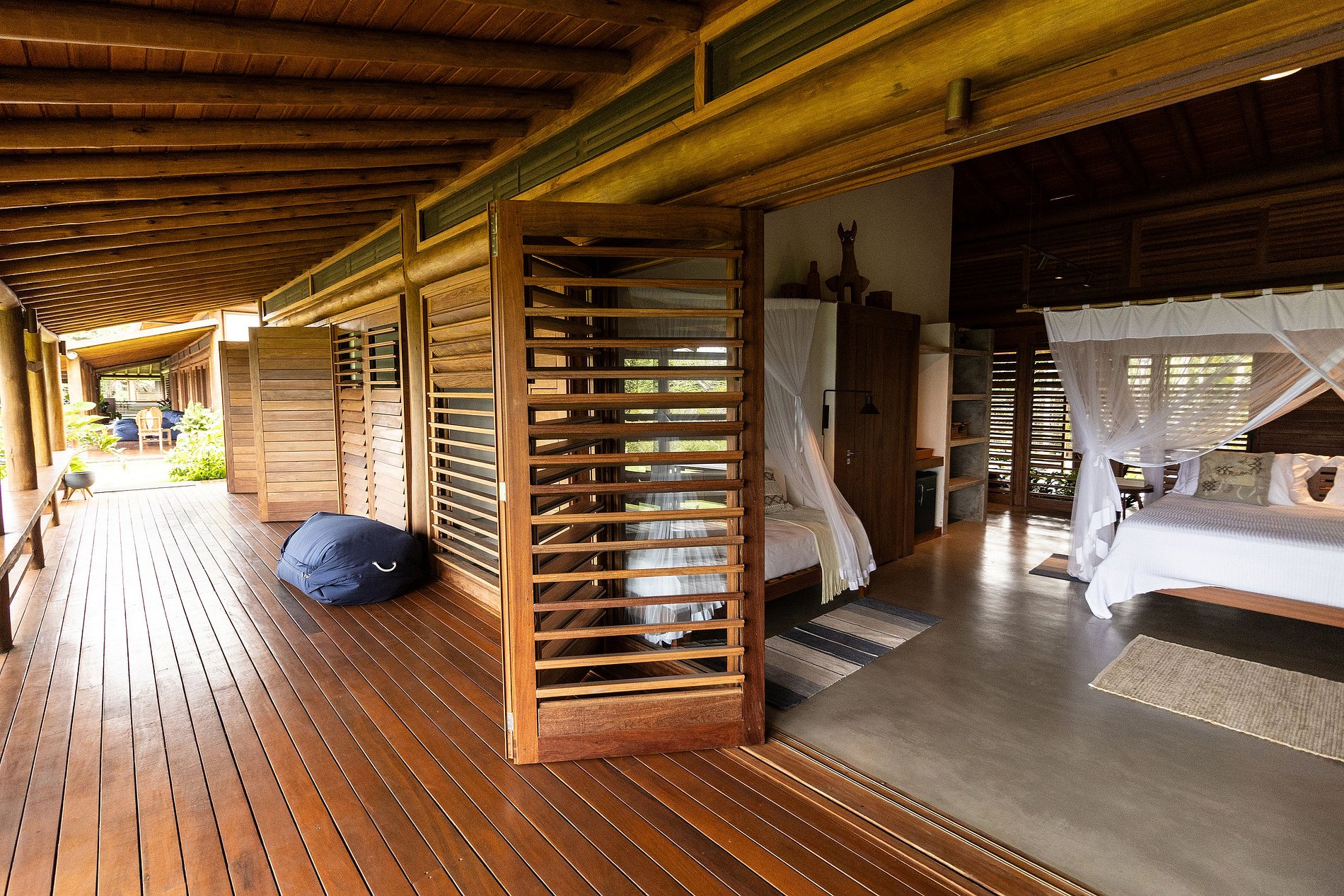 Alojamiento: La casa principal cuenta con tres amplias suites (camas super king). Una hermosa sala de estar con cómodos sofás y sillones invita a una conversación íntima. La sala de estar tiene vistas a la piscina, con su suelo de baldosas verdes que armoniza con los colores del entorno. Junto a ella se encuentra una cocina gourmet con una hermosa parrilla, horno de leña y una mesa de comedor para 16 personas. Los dos bungalows independientes, cada uno con dos dormitorios y un baño, cuentan con sala de estar y balcón con vistas al océano y a la Mata Atlántica. El pabellón multiusos es ideal para clases de yoga, eventos o actividades de ocio, equipado con mesa de ping pong, billar y futbolín.